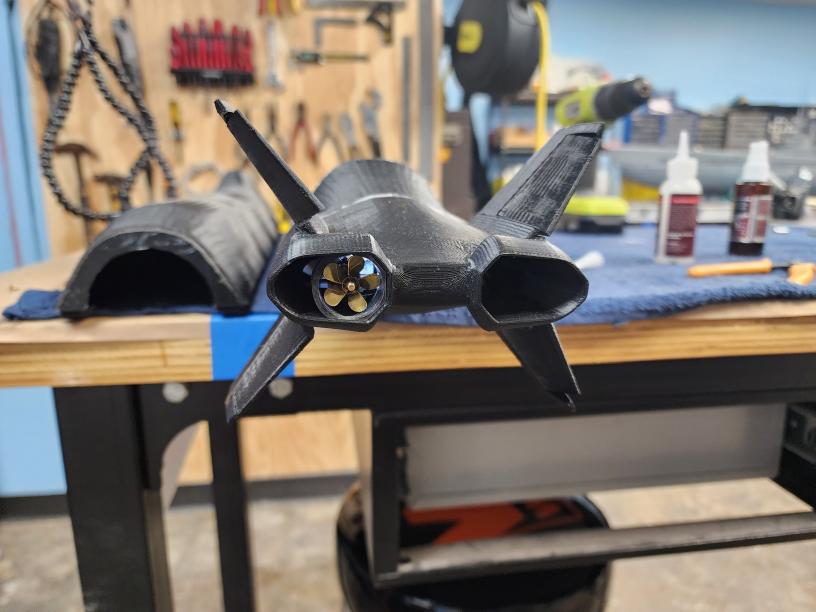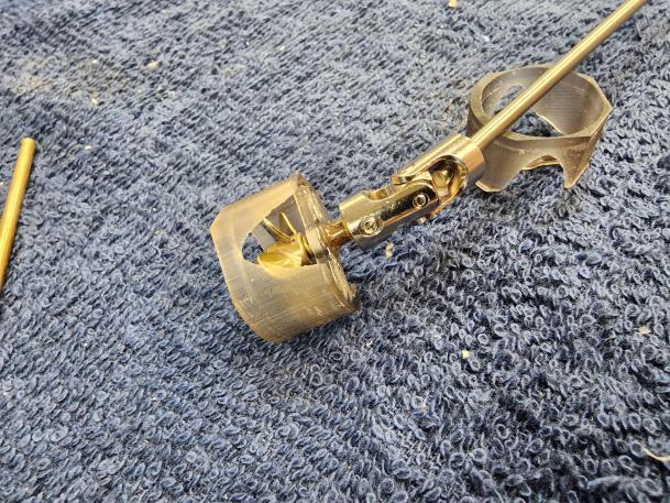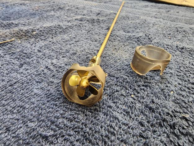 Parts needed: 20mm diameter brass props, 1/8" stainless shafts, 1/8" universal joints, 3D printed mounting bulkhead, 5/32" brass tube (for the thrust/reverse thrust bushing). It may be that we need to block the opening beside the prop shroud to stop water cycling around it, but we can test that first to see if it's needed. If we do, we might just get away with some plumbers epoxy pressed into the opening to make a nice, smooth filled pocket there. Heck, you could even sculpt in some cool venty-looking thingies, too.