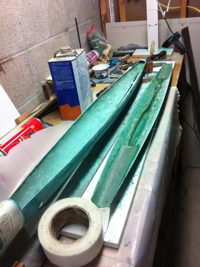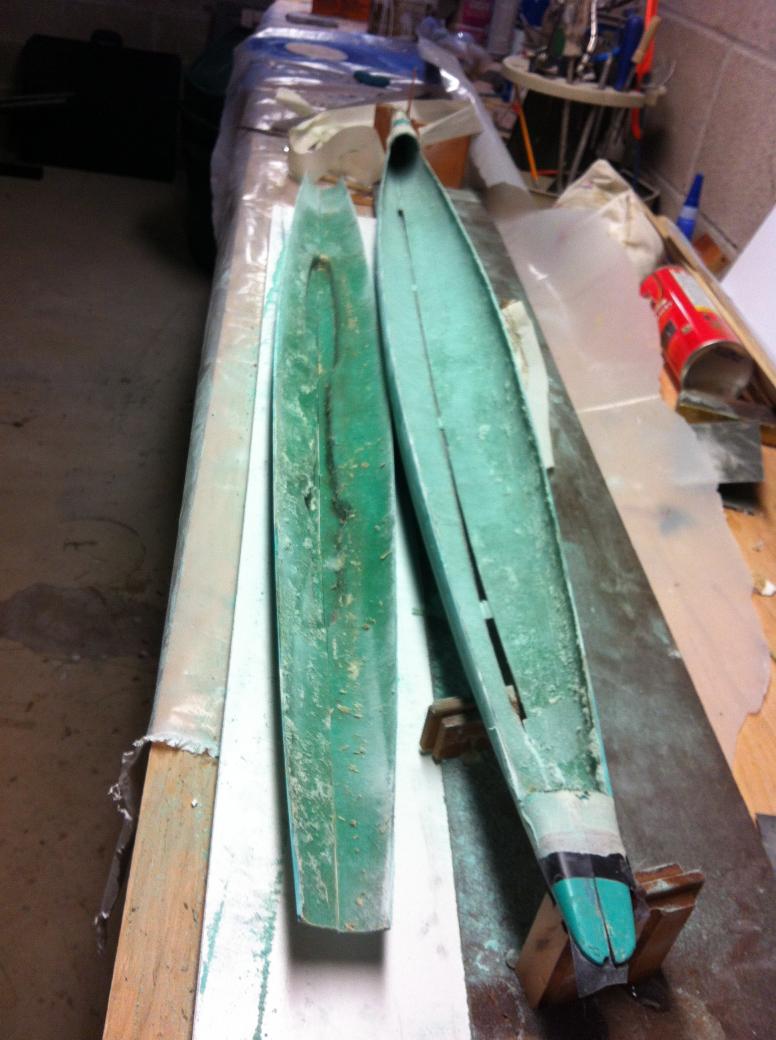Now to join the halves together. I taped them on one side to line them up, then used fiberglass drywall tape as it is sticky and very light. I coated the tape with epoxy.