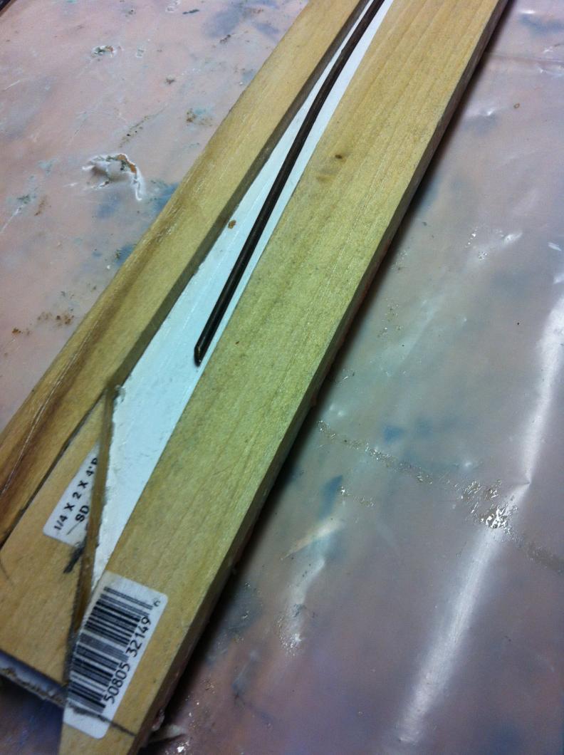 The keel is 1/4" wide, so I took some 1/4" x 1.5" wooden strips and hot melt glued them to some MDF board. A good coat of Freeman Wood Sealer, and then two coats of wax, should release the keel, but I don't care if I have to wreck the mold to get it out.