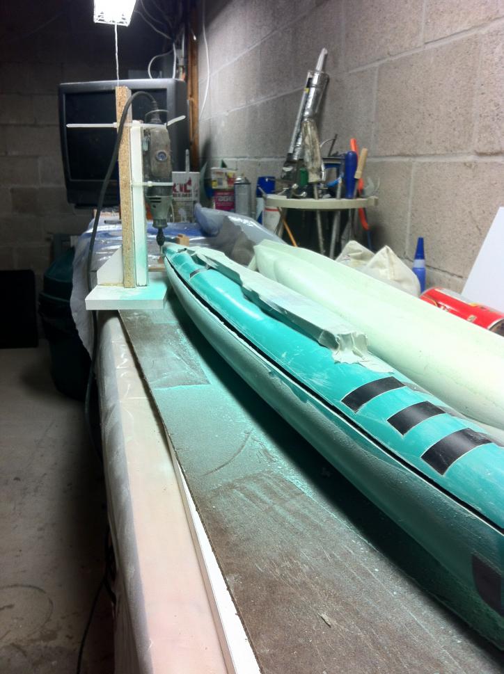 I taped the two halves together with masking tape, then marked the waterline at both ends. Then I blocked up the boat with wooden blocks and leveled it using the waterline marks. I glued the blocks and boat together with hot melt glue. It was pretty solid once the glue cooled.