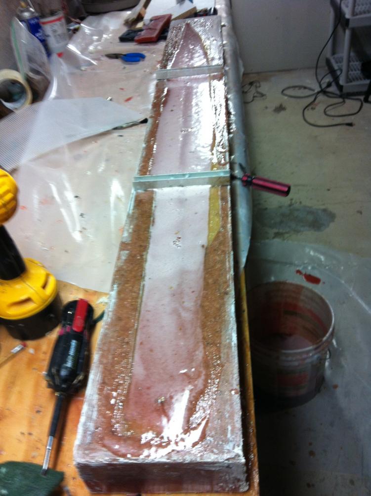 While we're keeping our fingers crossed and waiting for this resin to set, lets look at my objective here. This is a rough plug, to press the resin and glassfibre sheet together, and ensure it is an even thickness - 1/16" to be precise. The resin excess will squish out around the top of the mold and it will be scraped off before it sets.