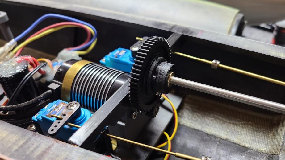 Thanks for the good info. Ed. This is what I did on my Thresher. Motor/ESC is the Mtroniks G2 Hydra 50. 1400Kv so at 12 Vdc looking at roughly 15,000 rpms under load WOT. It was direct drive. Modified now with a spur gear (Axial p/n AX1232075) 60T/32P, pinion 15T/0.8 metric pitch which is equivalent to 32P. 4:1 ratio so turning around 3750 rpm WOT under load. Designed and 3D printed the spur gear center hub, drive shaft front support, servo mounts and ESC/cap bracket to replace the integrated part that the motor mount secured to. Spur gear center hub rides on a 10mm brass bushing I machined on my lathe that secures an M4 x 10mm set screw against the drive shaft so the set screw is long enough to extend into the 3D printed hub preventing it from rotating. The motor mount was from my original design and just so happened to fit with a thin shim under it. One minor benefit is that the motor is lower in the hull. Going to give it a try like this. May be a bit unconventional but I like to try new things. To use one of your phrases, "easy peasy lemon squeezy".