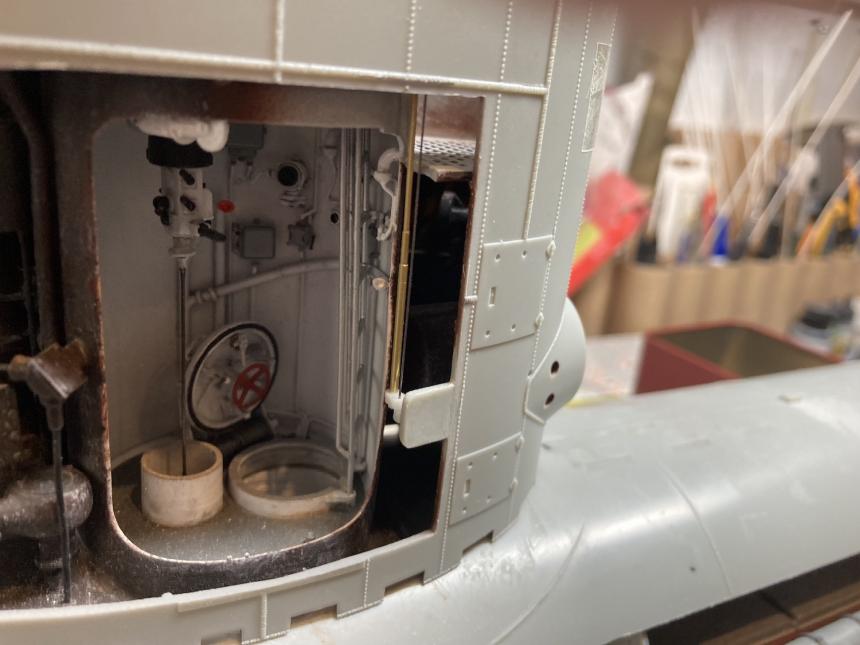 With the torpedo room just needing detail work, I started to lay out the foundations of the control room and the galley. The control room was tiny and had, just like the XXIII, a radio room on the starboard side. Below the floor plates was a pressure tight regulating tank. The galley was tiny an located in a 2 meter diameter pressure hull with exterior frames that was suspended in ballast tank II.