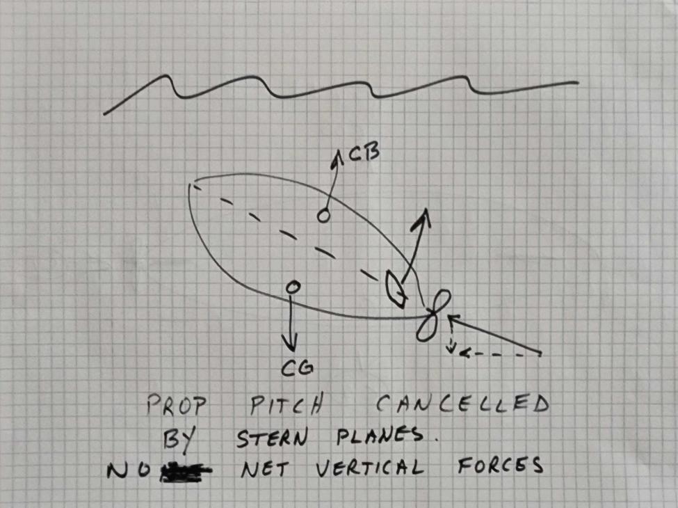 The stern planes and propellers are aft of the center of gravity and center of buoyancy so the stern planes can cancel the pitch vector of the propeller thrust.