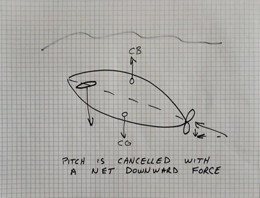 The centers of buoyancy and gravity are between the bow plane and propeller causing the boat to ascend or descend.