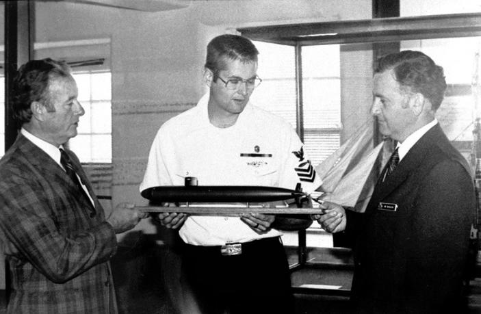 While I was a member of the YOSEMITE's dive-locker I built a 1/192 model of an LA. Here I'm 'donating' it to one of the Navy's museum's -- I forget which one. I did this sort of thing to fatten up my resume. Which served us well when we set up D&E Miniatures -- when you brag that you produce 'museum quality', it helps with the brag if you can rattle off the museums your work has actually been displayed in.