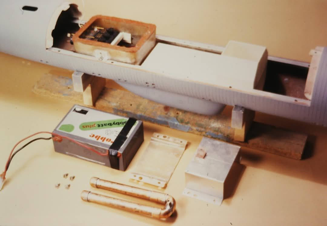 Definite Blast from the Past! I remember wrestling with some tech from this era on an early Engel Patrick Henry. I recall the no-hardware box lid and thought it was a great way to reduce the number of potential leaks, but was still accessible, albeit with an Exacto knife. I installed the top half of an aluminum 35mm film container on the lid to provide access to a power switch and charging jack. Your receiver and speed control are also familiar, amazing how much smaller and cheaper those components are now! Thanks for the post.