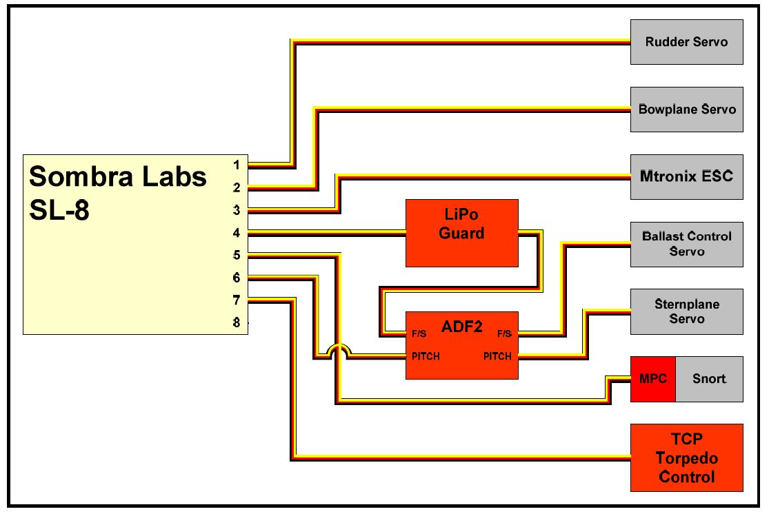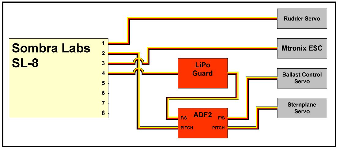 so on page or 5 of my build log dave put in a block diagram of the componants i have the regular failsafe not pictured.i have the lipogard and the adf2. i get that the out put of the adf goes to the stern planes. but both the the lipogard and the adf2 instructions say the hook up to the ballest servo. do i need a y harrness to make that so.daves diagram says lipogard then mtronics failsafe to ballest servo ... the angle driver is an older one im guessing so that is why it shows only to the stern planes???????help??????newbie overbord.also would these be ok mounting points?.
