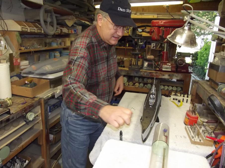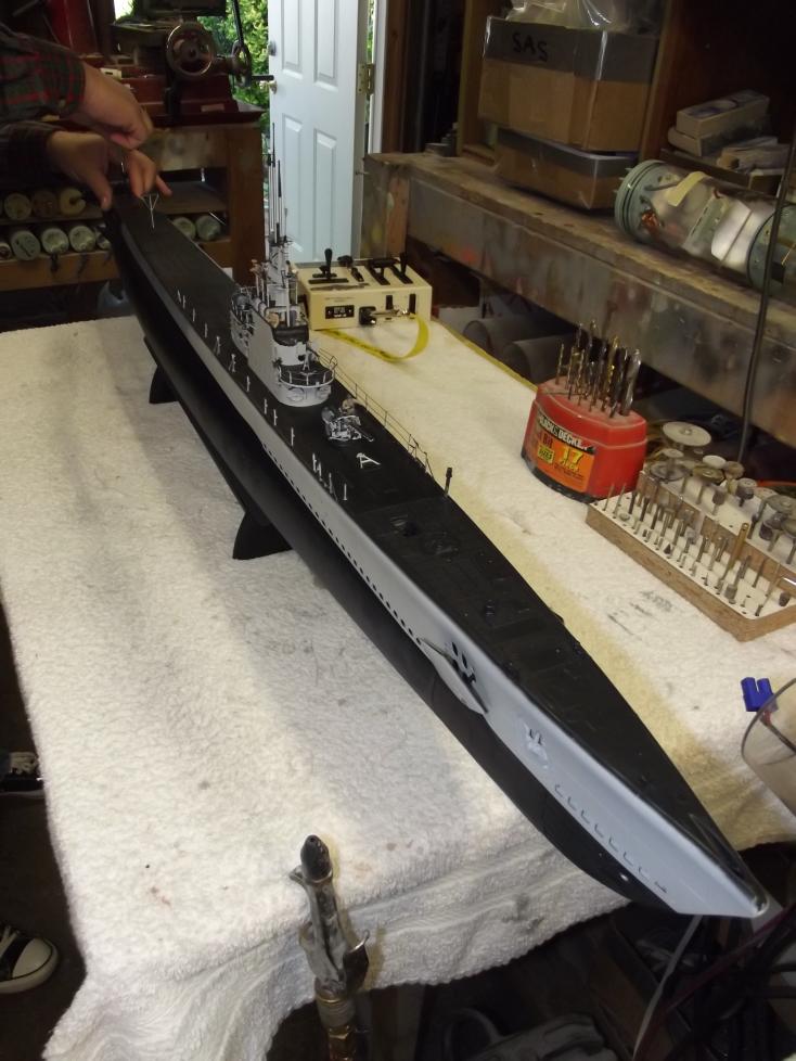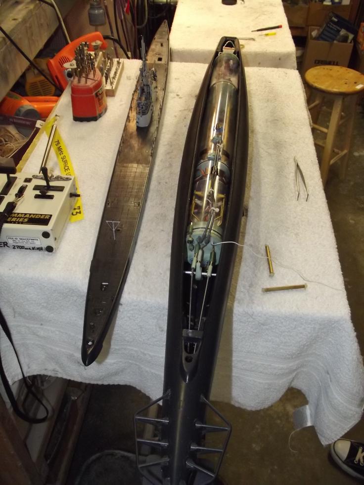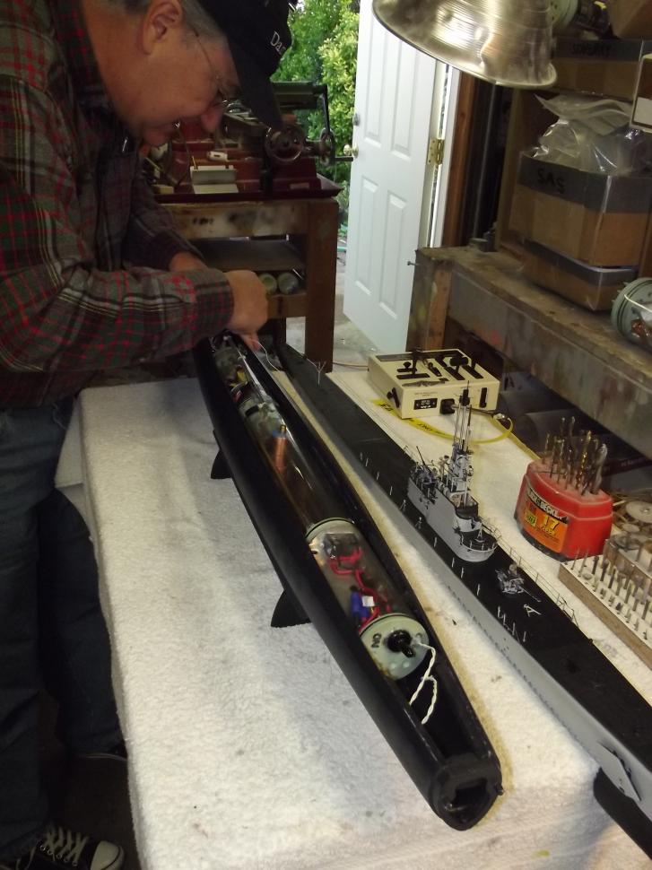 A big innovation, which eliminates much of the clutter atop the SD with my version, is the mounting of the long-running bow plane pushrod and retract mechanism torque tube into the top of the superstructure, up and out of the way -- the interface between those linkage elements, and the SD below in the hull, made through magnets that make up to the SD pushrods. Only tool involved in assemble/disassembly is a screw driver. Things go together as if by magic ... the magic of magnetism (thank you, Brian Stark!).