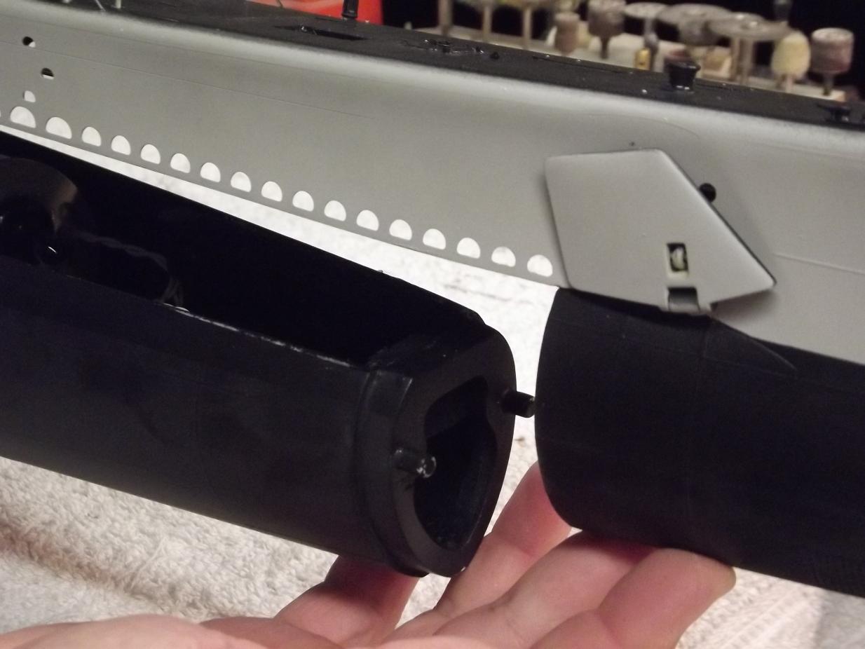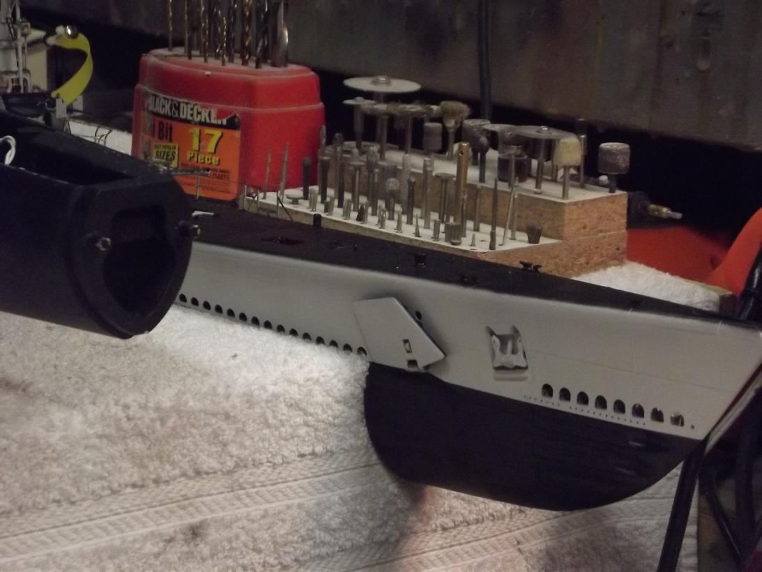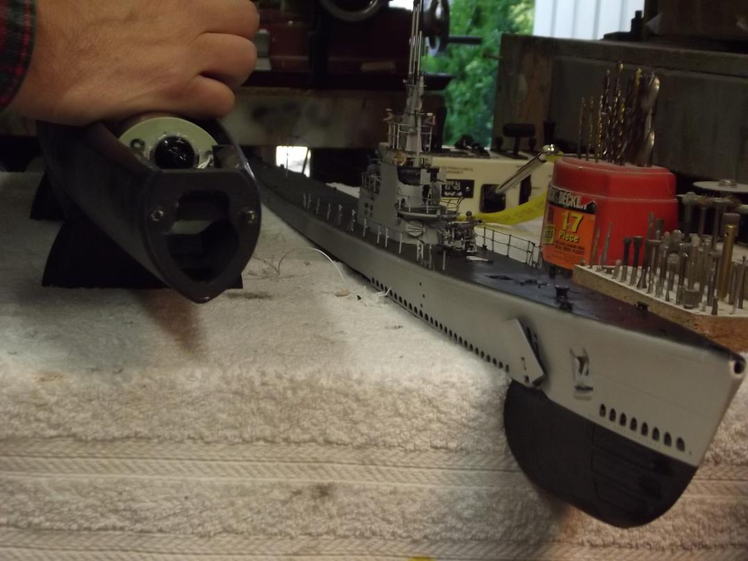 Gene Berger has convinced me that the best way to access the interior of the Revell 1/72 GATO is through the superstructure -- as so many others have done with limited success. Gene's twist -- that makes that access arrangement so easy to fabricate and use -- is use of two transverse bulkheads up forward that make up, either side of the kits bow radial break line. Two capture-indexing pins-holes between the two bow bulkheads capture the superstructure onto the hull forward. A single screw back aft holds the stern of the superstructure down onto the deck. This eliminates the much dreaded task of sawing longitudinal breaks at the waterline, either side of the hull -- good news for those wishing to r/c this excellent plastic model kit.