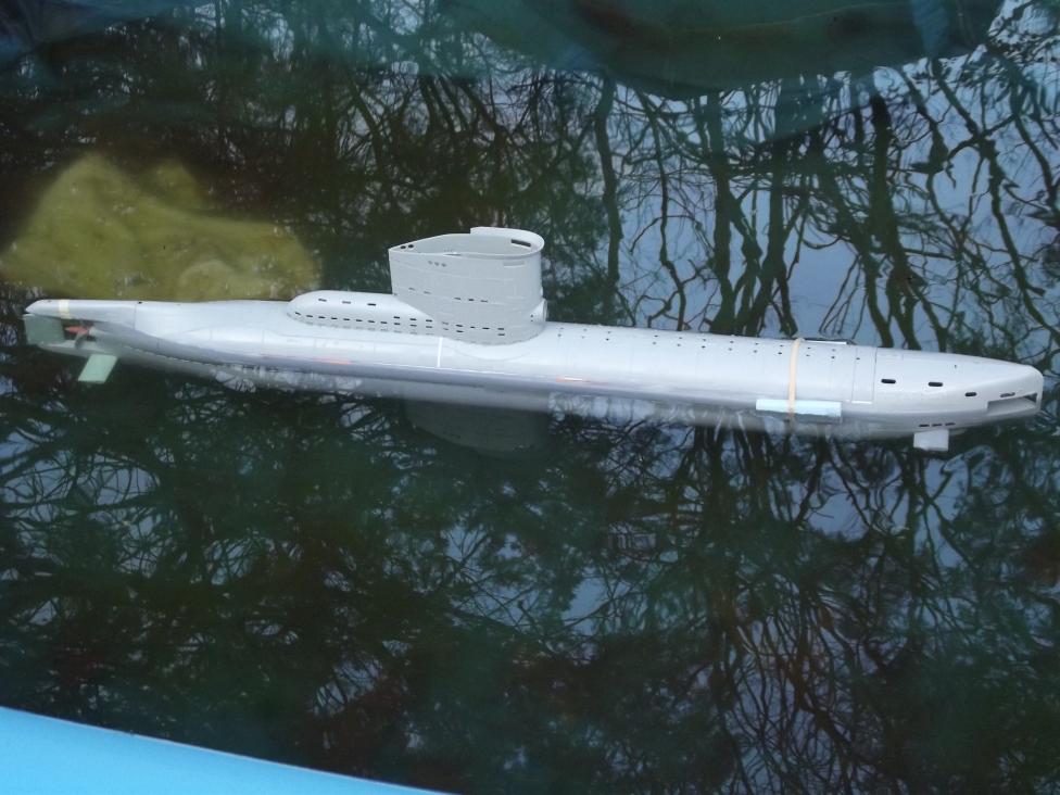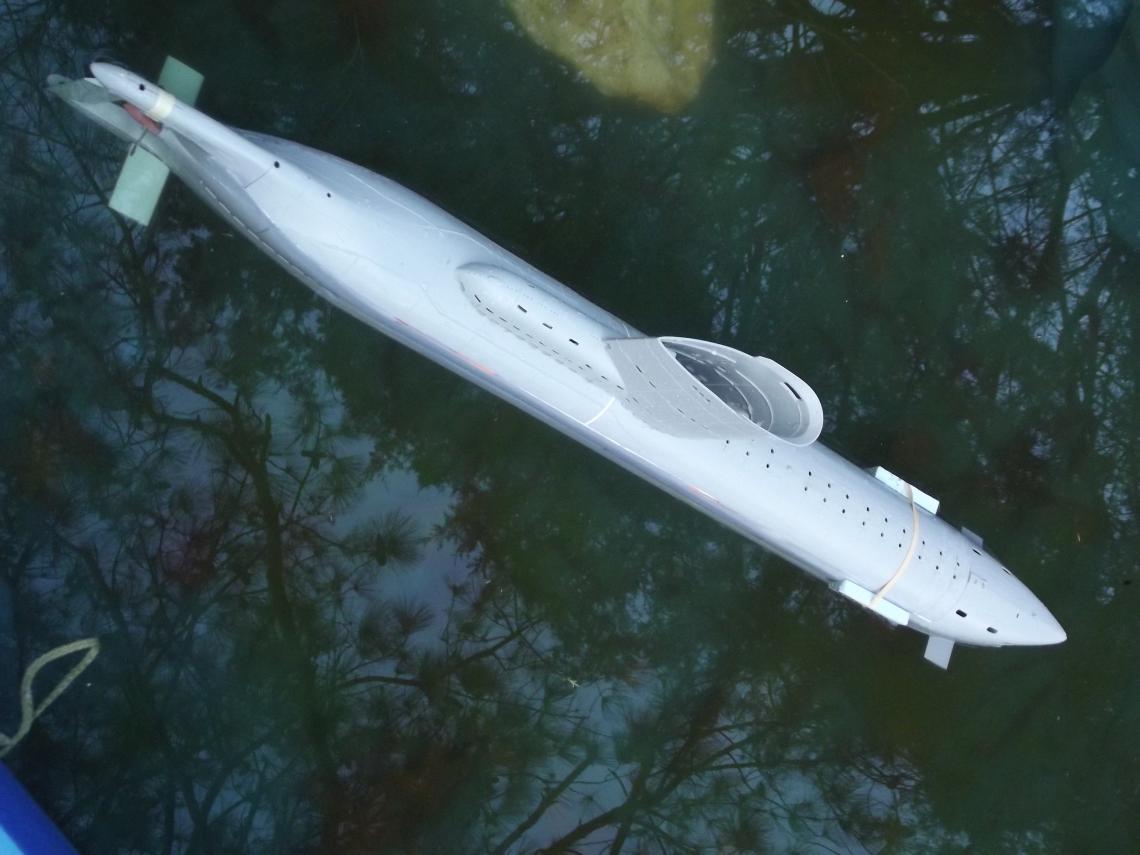 To my relief I find that I've put more than enough ballast tank in the SD to pull the detailed model down beneath the waves. When I calculated total displacement of the kits above waterline portions I designed the ballast tank to hold about 120% of that weight, and it seems I'm well within that ball-park after todays trip to the kiddie-pool.