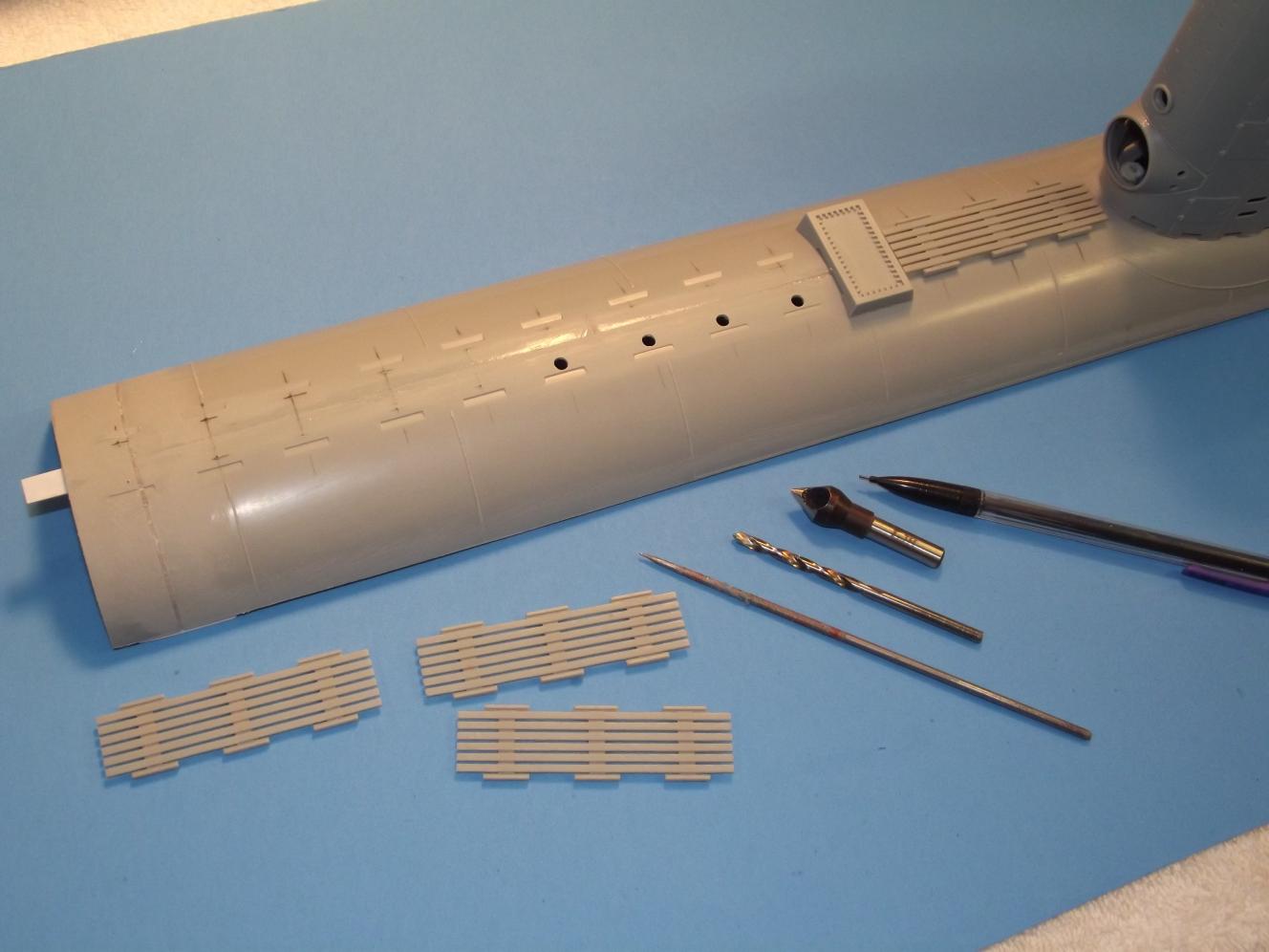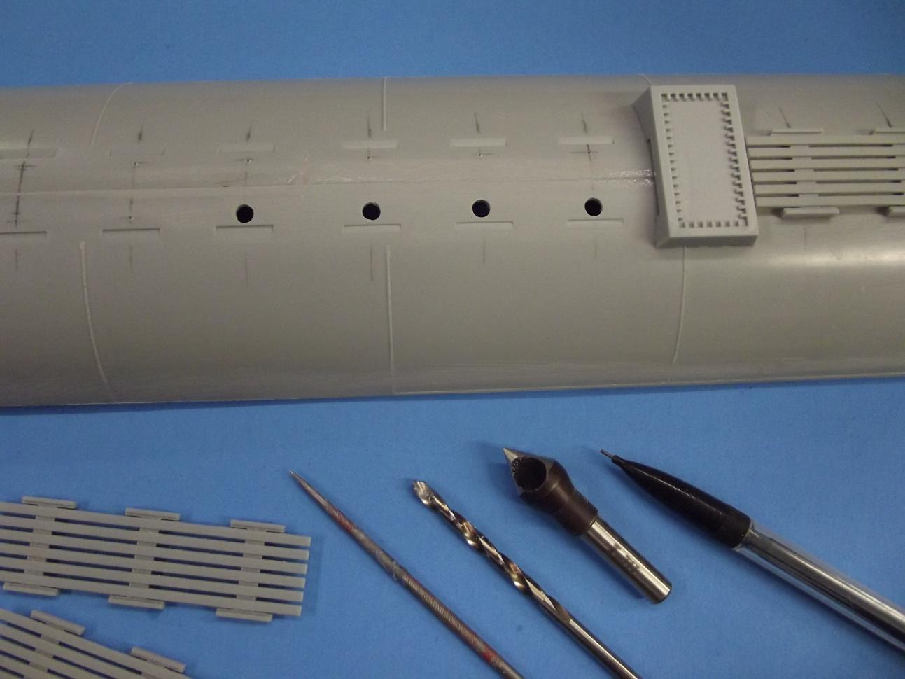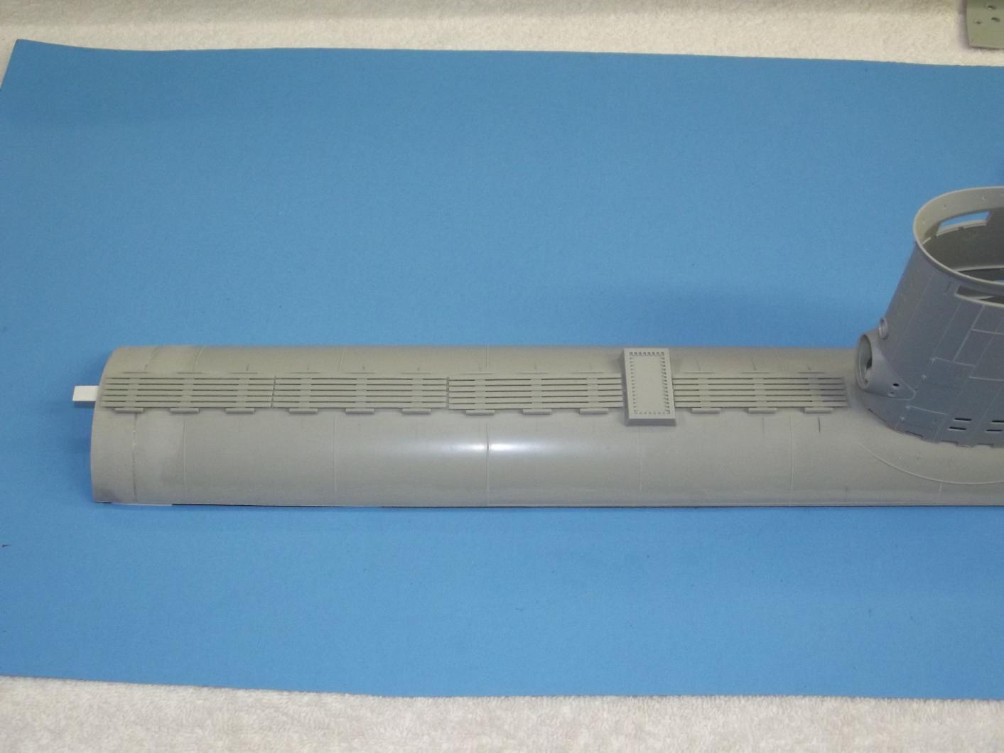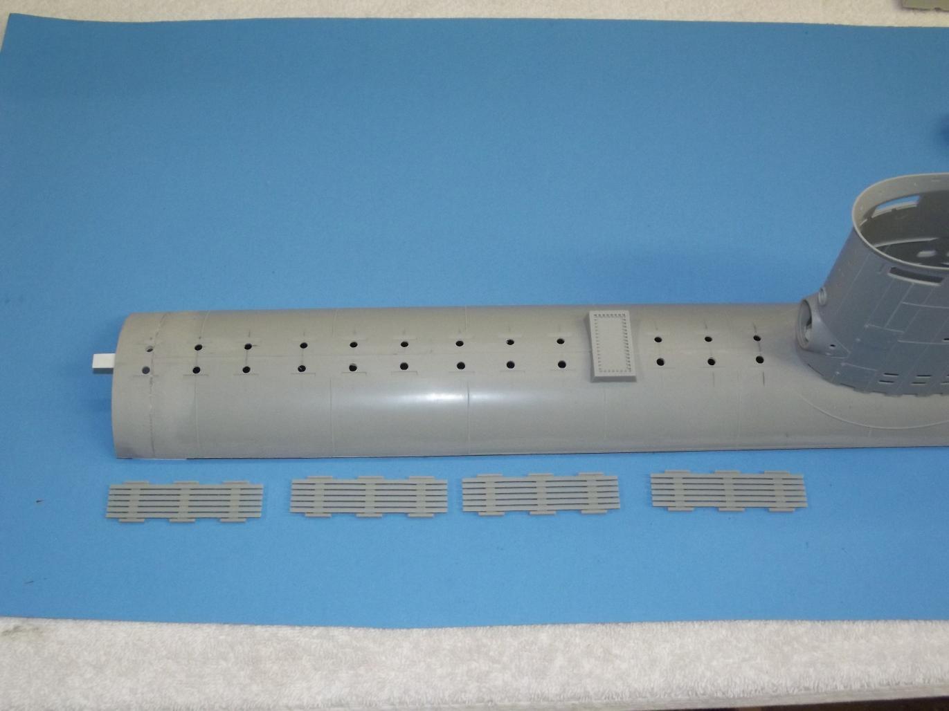 As to the need of venting the upper hull so I don't catch bubbles of air during the dive, I punched a lot of holes atop the deck. These holes hidden under the eventual planked deck pieces, but right now right out in the open. When I do the final trim, I'll have to stick all pieces in place to get the actual displacement, but right now it's good enough to leave these fragile (read: breakable) pieces off-model till I'm done with it. also punched holes into the stern to insure the quick and sure escape of bubbles as the hull goes under.