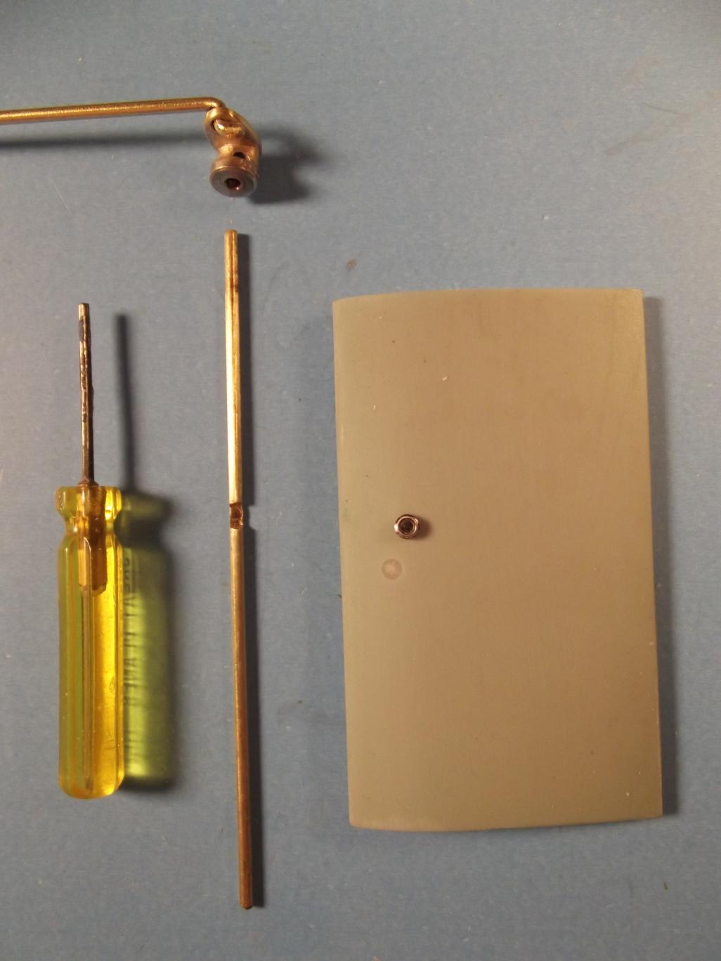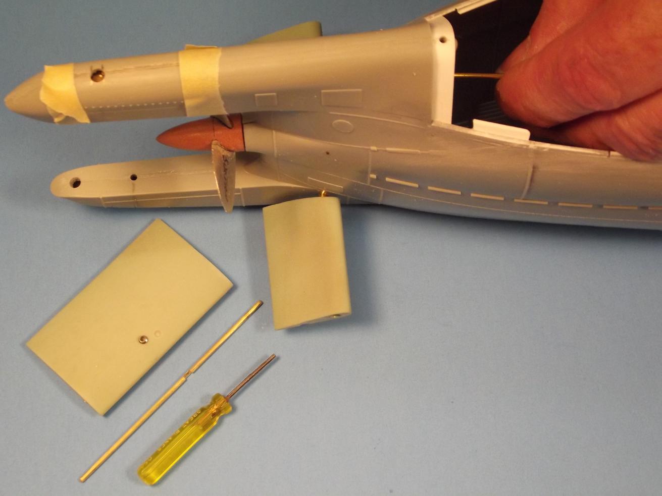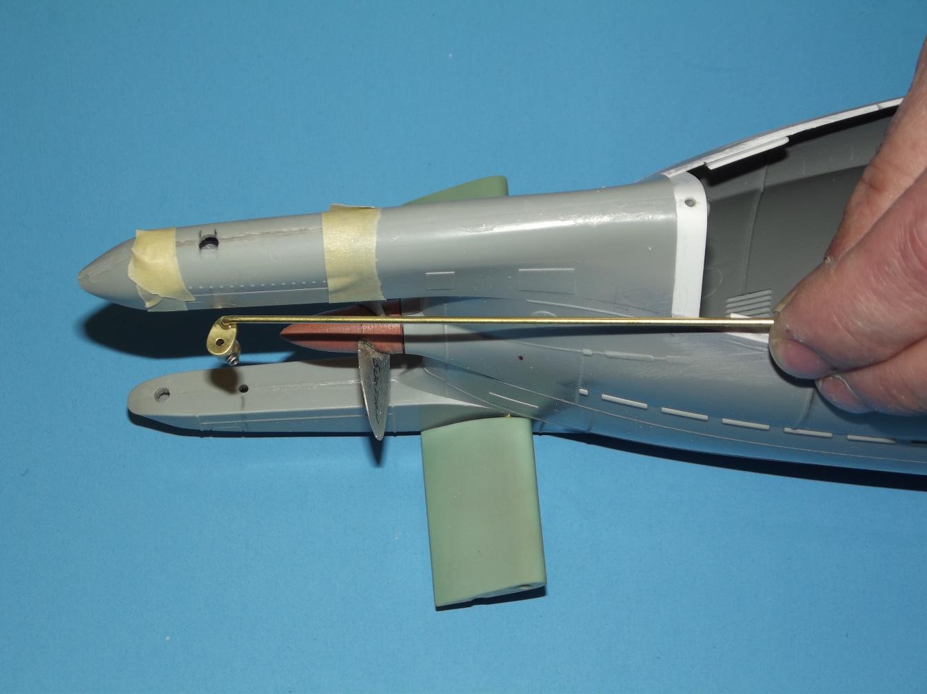 I needed to verify that the rudder linkage could be made up without need of cutting the hatch I've done on this model. The ideal is to push the rudder operating shaft up from the bottom, first up through the lower rudder support, through the rudder, up into the upper rudder support and into the bell-crank bore, then slipping an Allen wrench in there to tighten up the rudder bell crank to the upper end of the rudder operating shaft. The operating shaft made fast to the rudder proper by a set-screw set into the rudders port face. A 1/8" diameter vent hole atop the upper rudder support permits observation as the bell-crank is set into the rudder operating shaft. It worked!