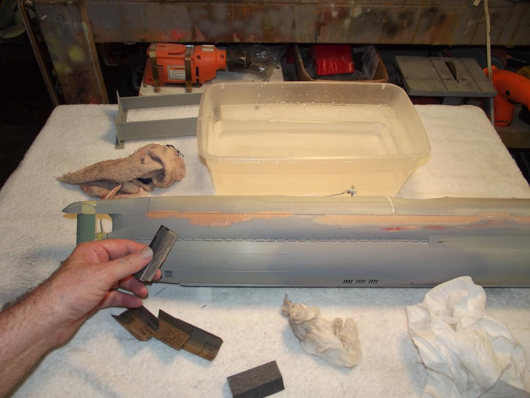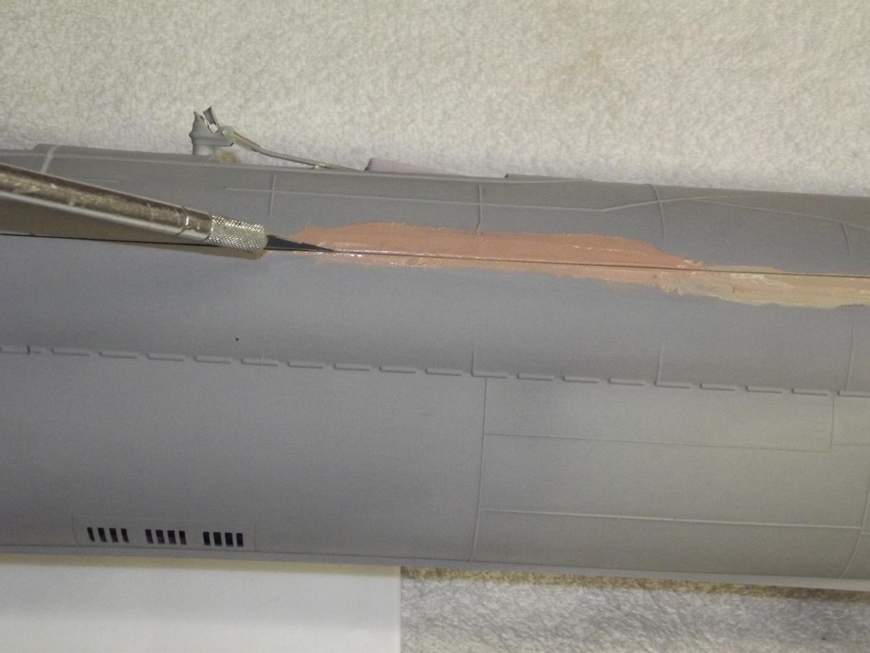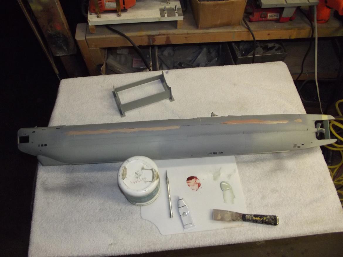 I tightened up the longitudinal and radial seams between upper and lower hull halves by first laying down some two-part filler and sanding that back, followed by some touch-up putty and another sand down, then primer. This is tonight's work: