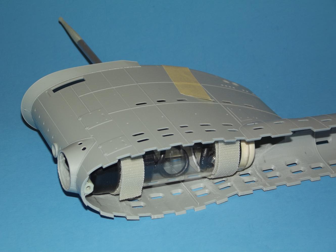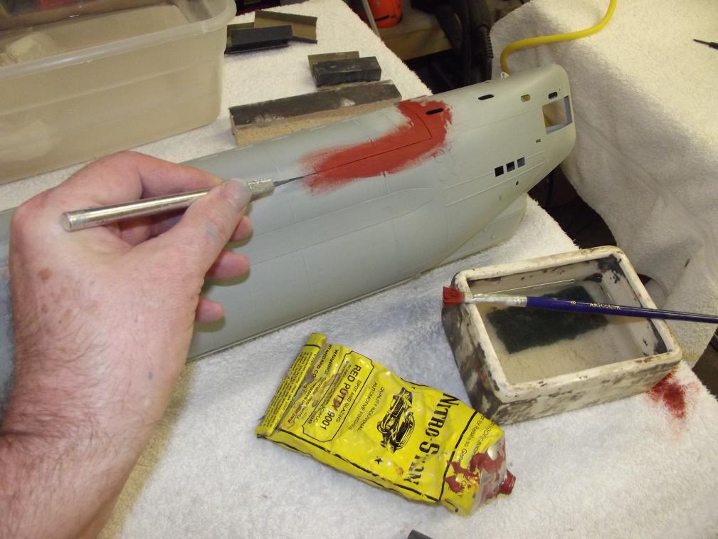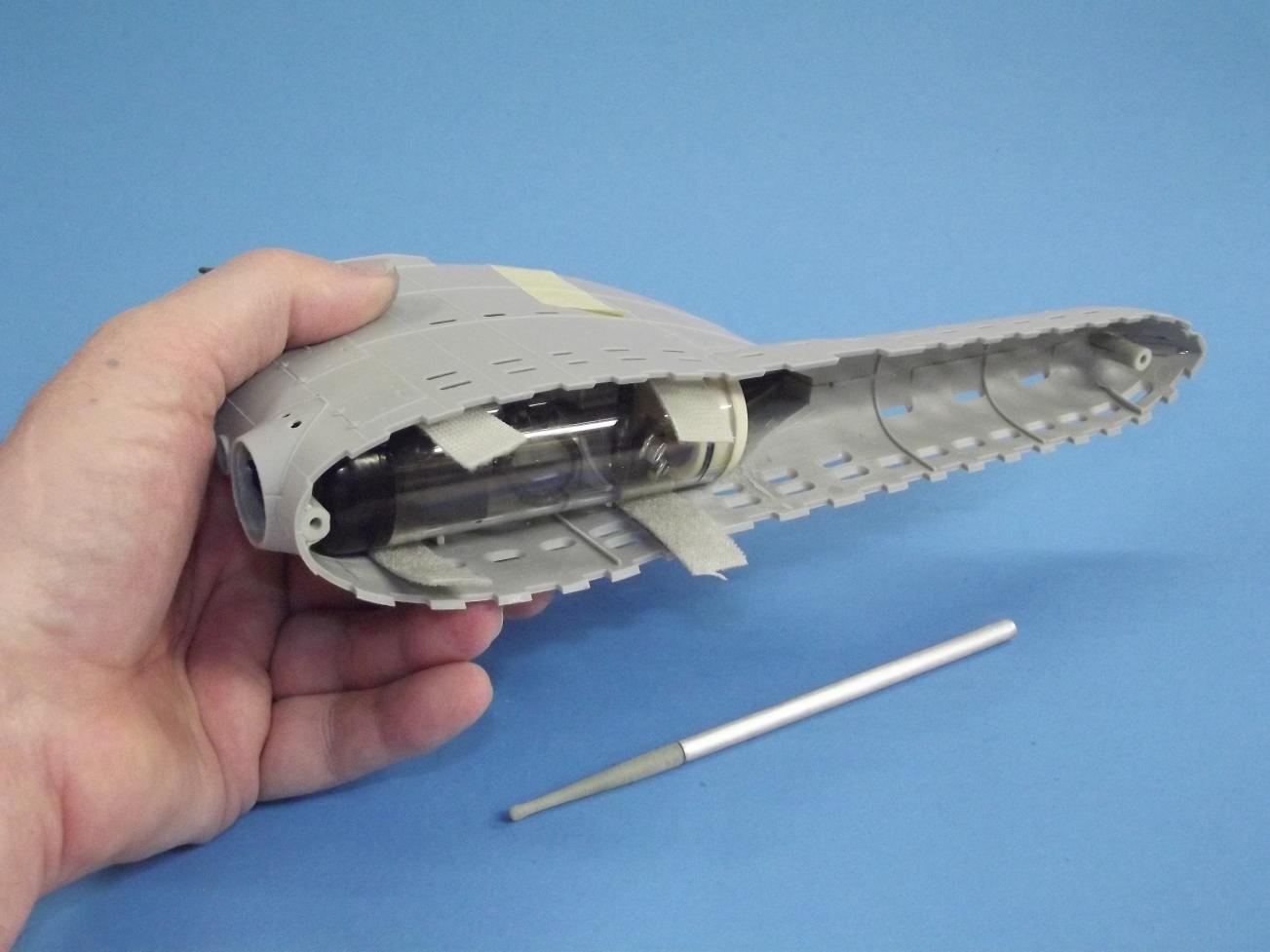 I tightened up the longitudinal and radial seams between upper and lower hull halves by first laying down some two-part filler and sanding that back, followed by some touch-up putty and another sand down, then primer. This is tonight's work: