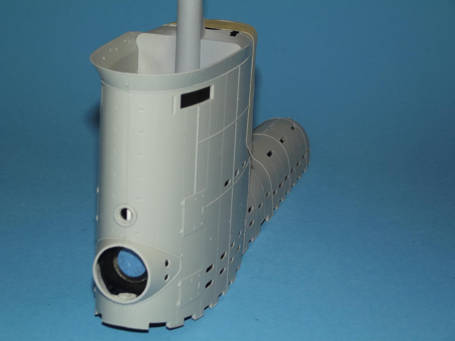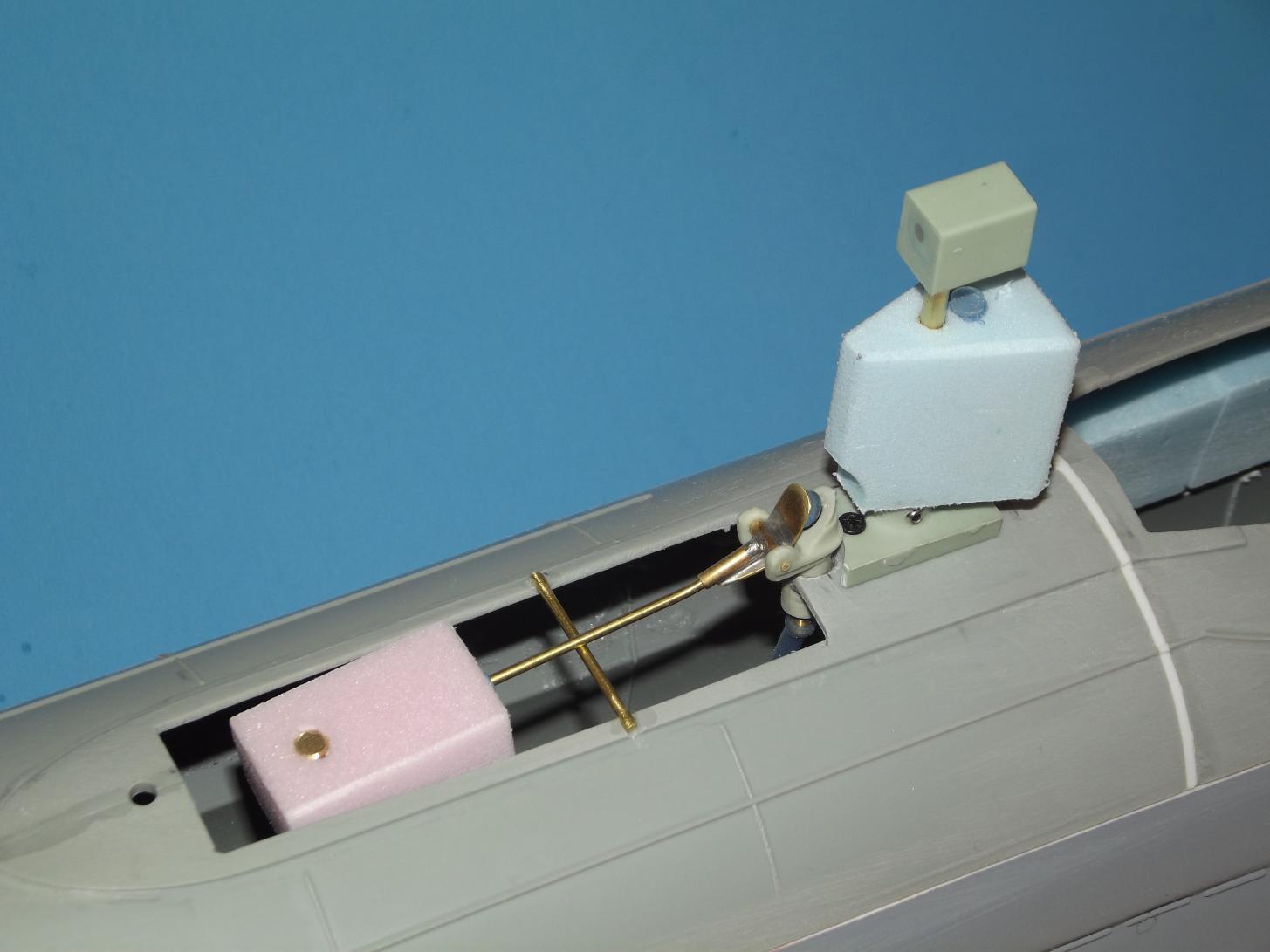 Of course (as Romel pointed out earlier today ... or was it yesterday morning?) inclusion of the Up-Periscope in the sail meant relocation of the SAS snorkel assembly. This mean moving it from the sail proper and cramming it into the much lower diesel exhaust muffler fairing. And that drove me to make use of the horizontal type snorkel assembly instead of the original vertical type snorkel assembly. Done!