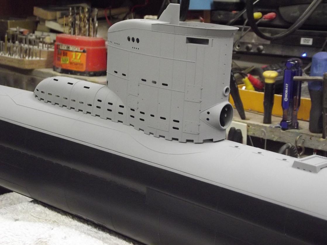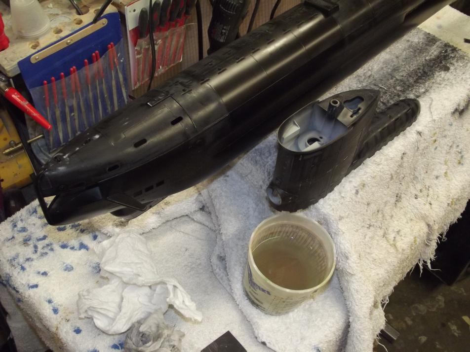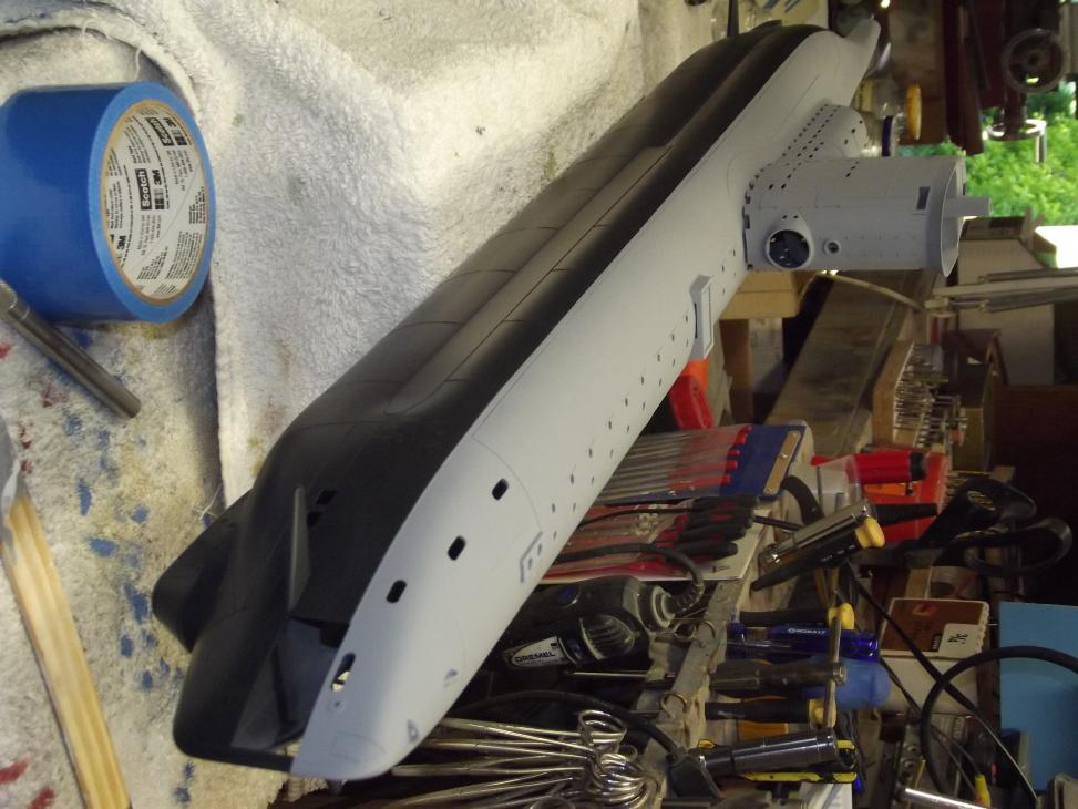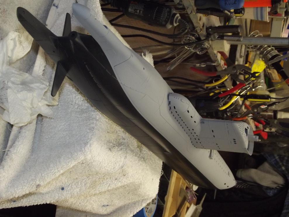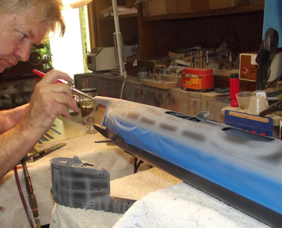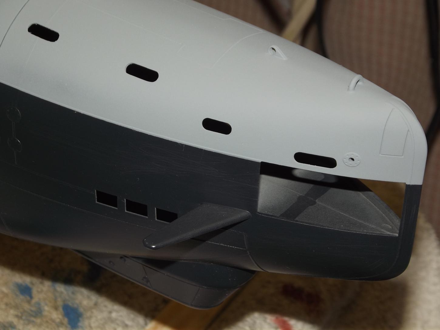 All in preparation for the two basic 'colors'. Dark gray below waterline and a lighter gray above waterline, with a black boot-topping serving as the demarcation band between the two grays.
