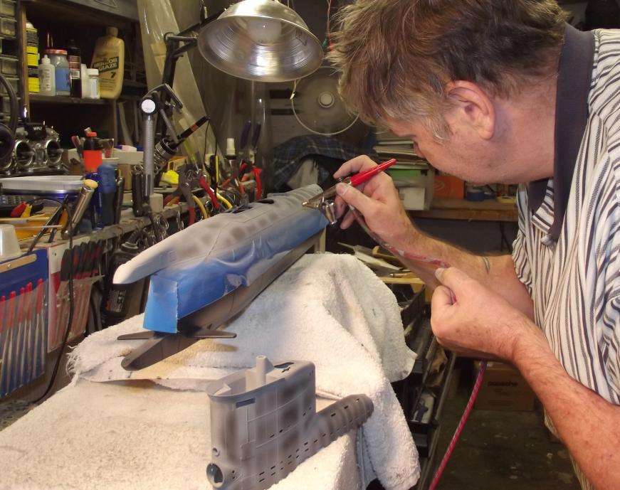 Over the weekend I laid down the black base-coat. Nothing reveals open seams, sanding and file scratches and other imperfections better than black! And I want all the corners, edges and tough-to-get-at stuff black so that when I lay down the colors I won't have to deal with light areas where I fail to get complete opacity.