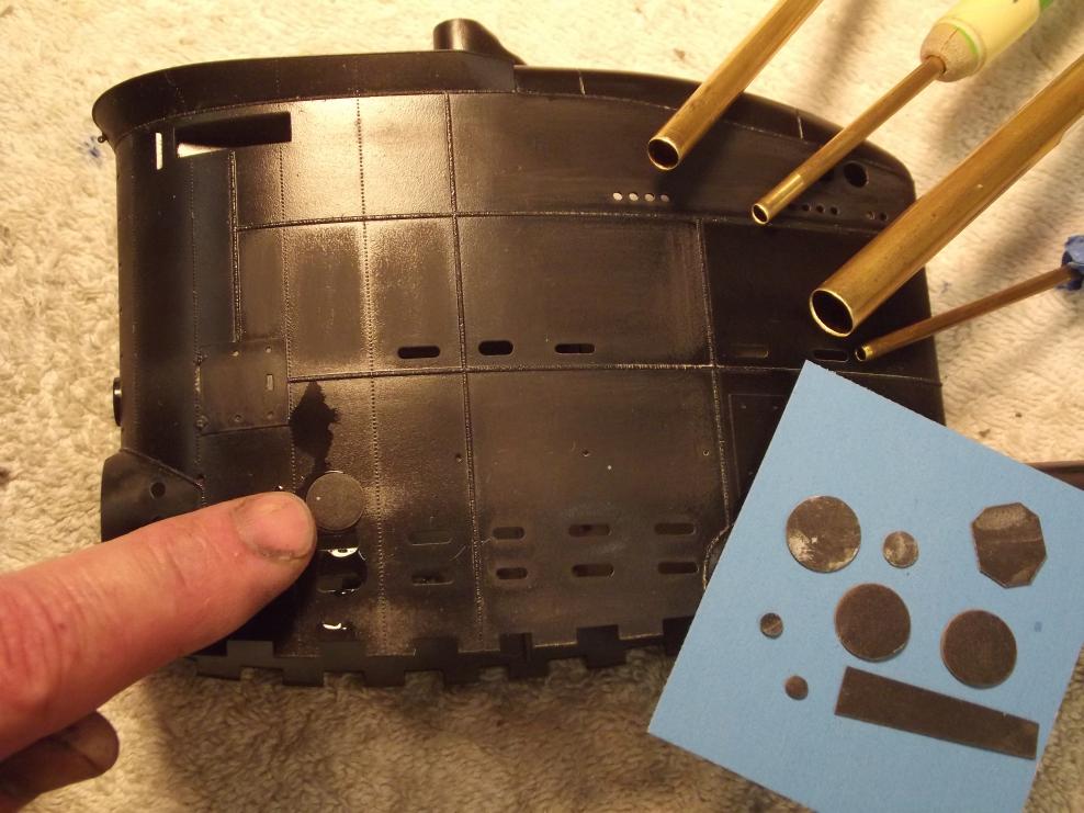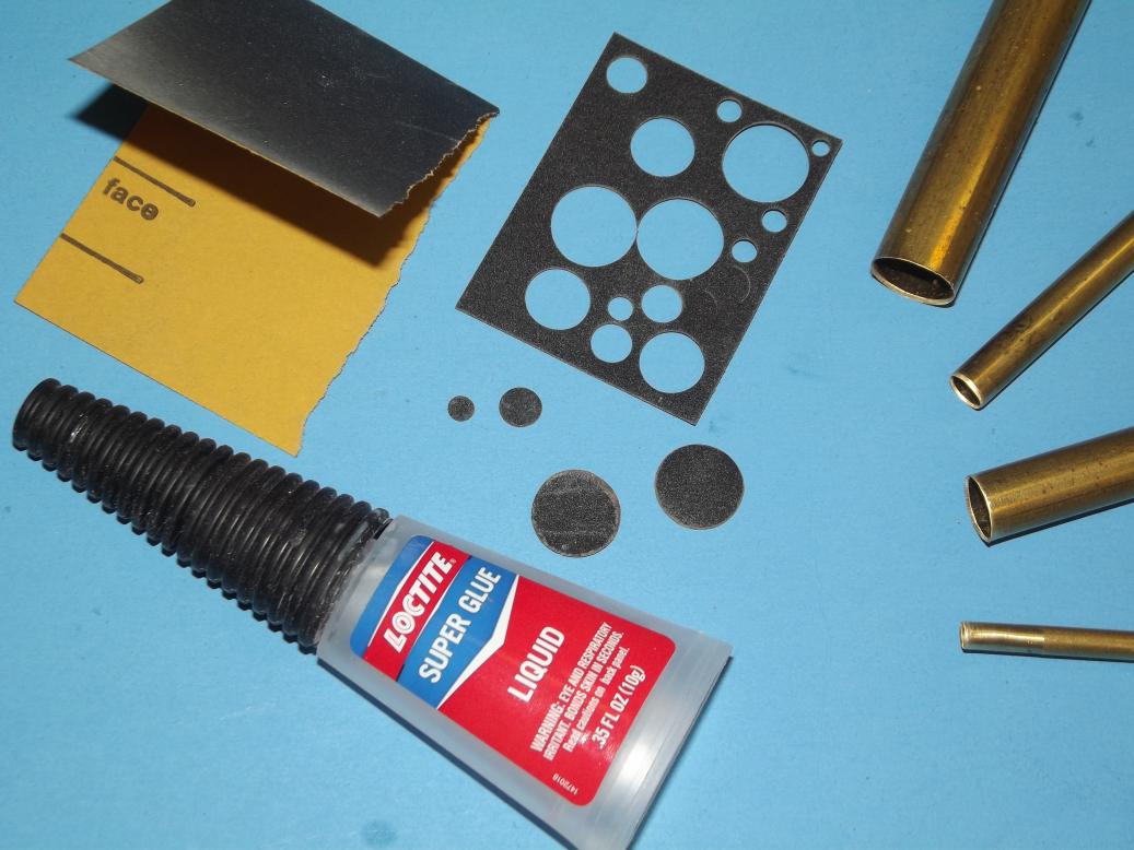 The black check-coat was covered with a heavy clear-coat and sanded down after it dried. And what a chore that is, having to cut around all those weld and screw heads. To make the sanding task a bit easier and precise, I punched out these little #600 grit sanding discs from double-sided sandpaper with brass punches.