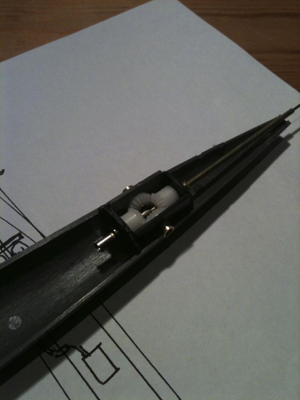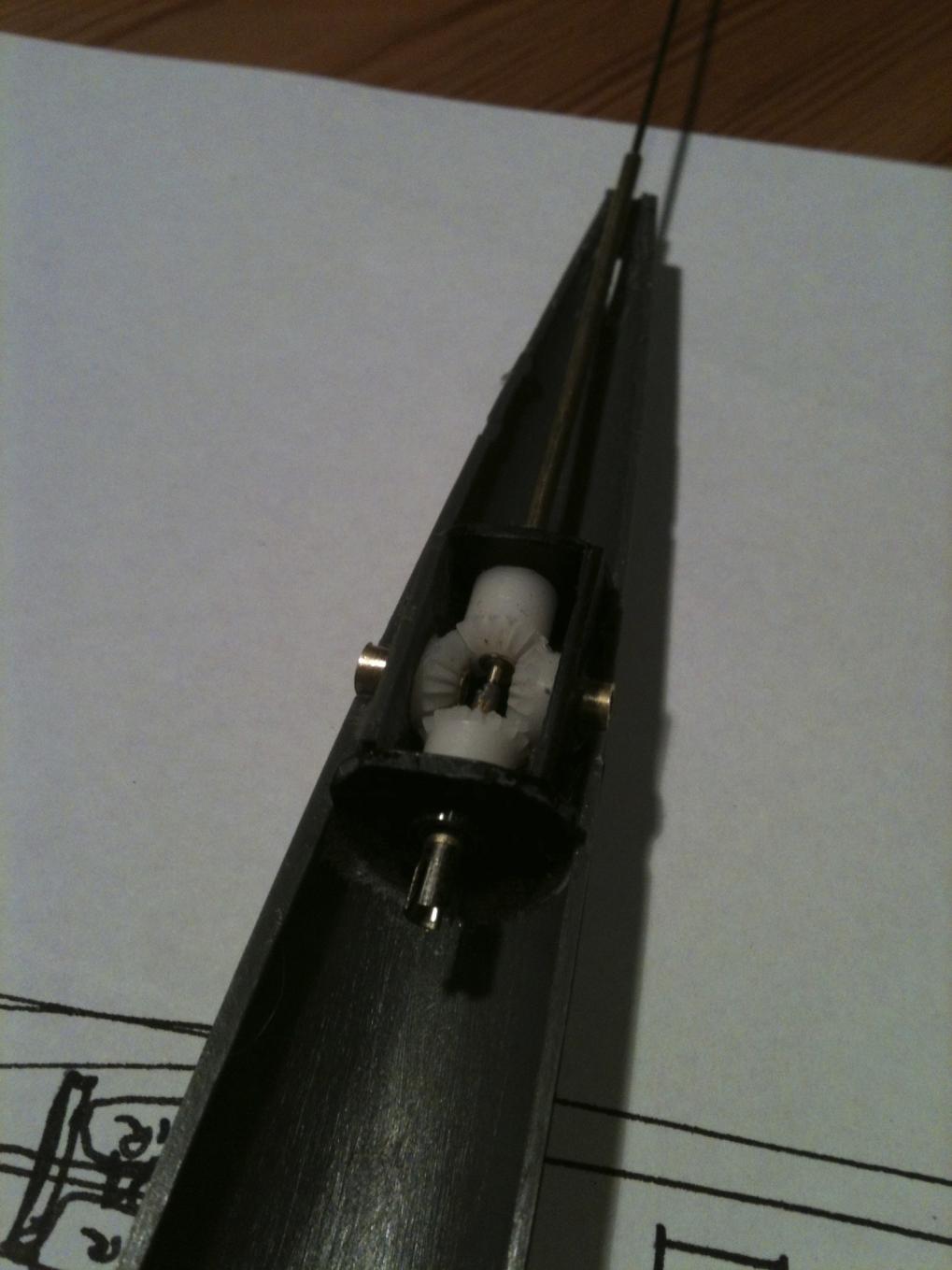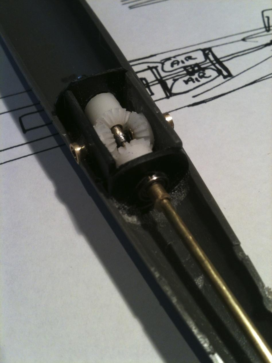 The new arrangement used bevel gears and keeps the box outside the WTC where it belongs. Also discovered that the rudders were way too small and relatively ineffective. Made a new lower skeg and rudder.Comment