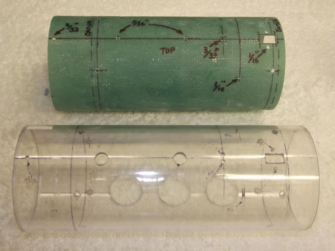 I employ this GRP, tube shaped templates to guide me as I lay-out the hole pattern unique to the specific type Sub-driver Lexan cylinder undergoing manufacture.