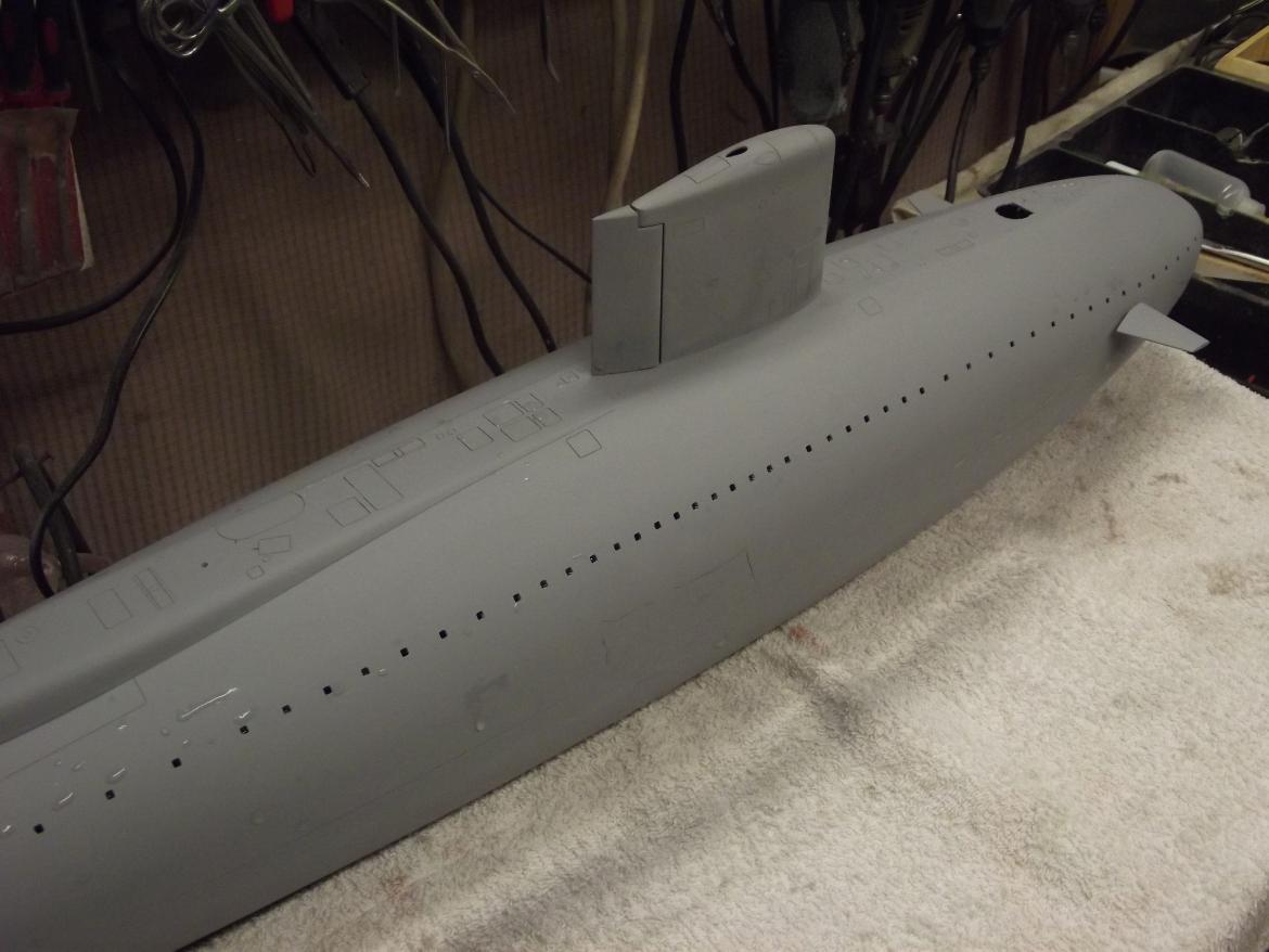 I've gone with Skip's old kit just to serve as a mule to proof the fit of the 'new' stern, sail, propeller, yokes, SubDriver and some other items that will go into the eventual Caswell-Merriman 1/60 GRP-resin ALBACORE kit.