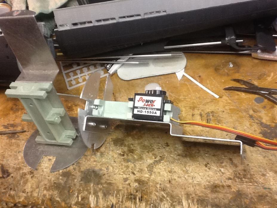OK, trimmed the servo carrier, but actually should have done jus tone end slot. I am stacking them staggered due to the screw tabs on the servos overlap. I suppose they could have been removed and just used RTV to secure them, but screws are fine. The two aft are mounted a few mm higher, which lines them op level with the two center pushrods holes. This rig the will be the rudders and dive planes. The two forward will be the retract and bow crap.Click image for larger version