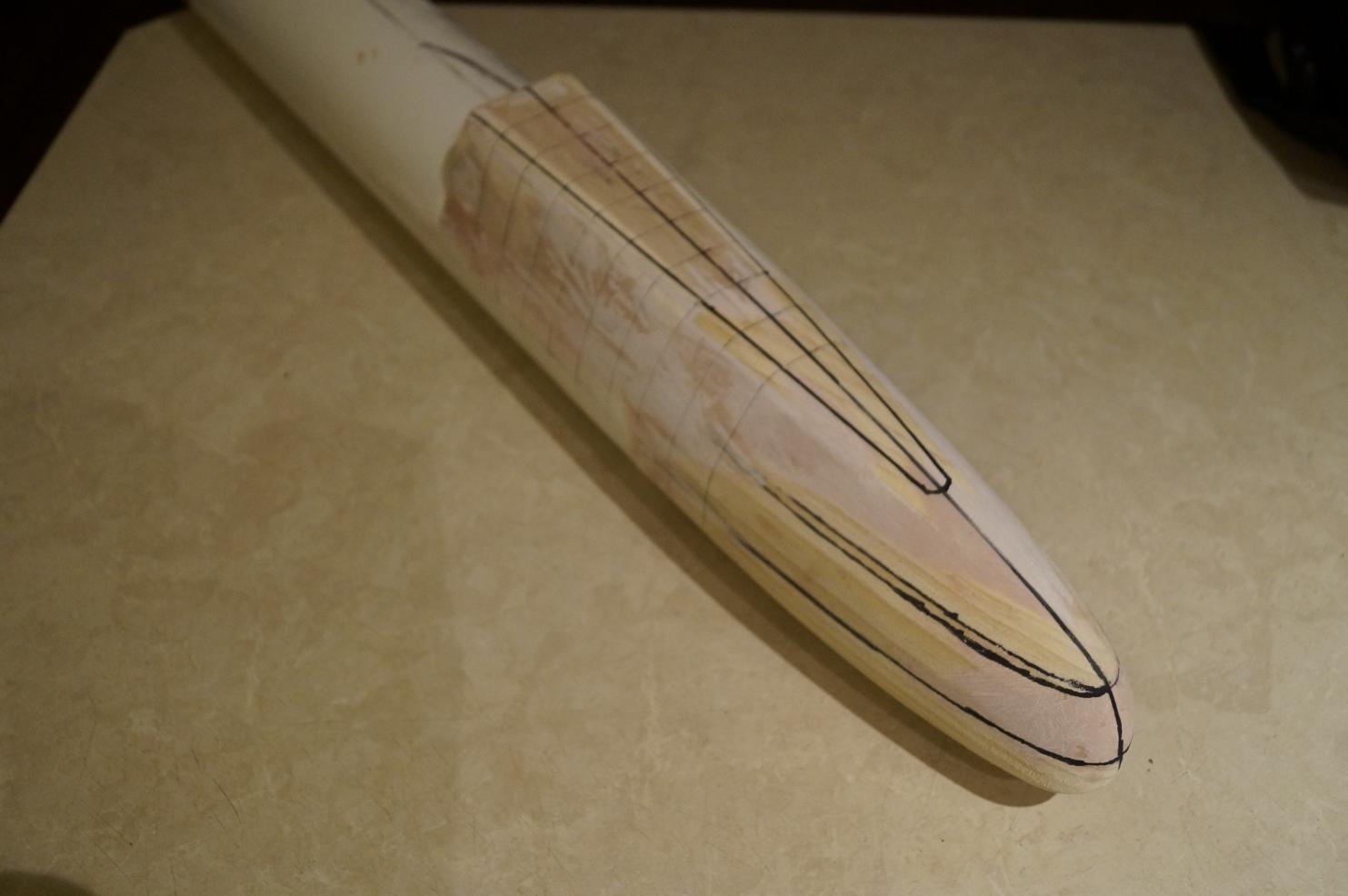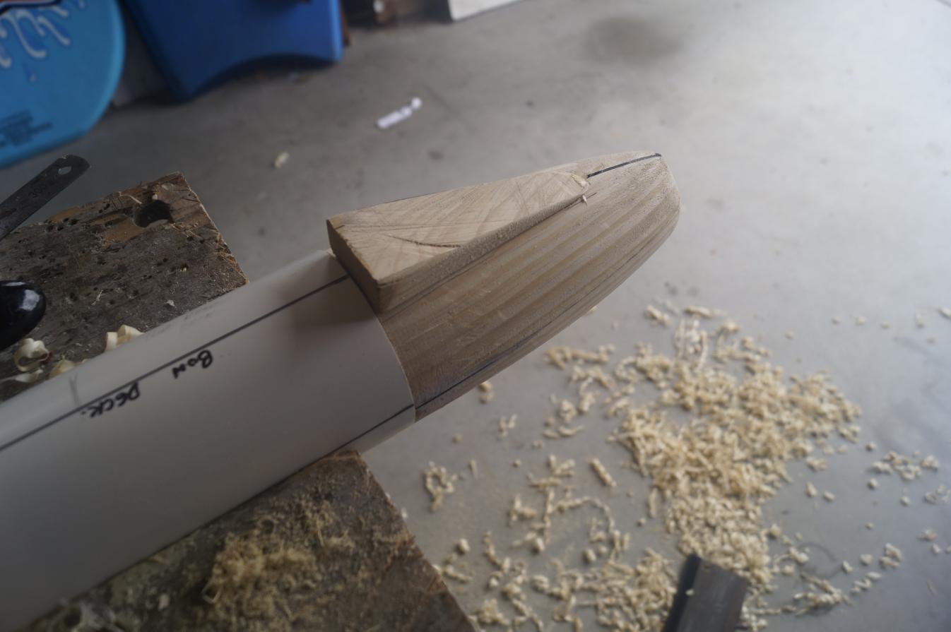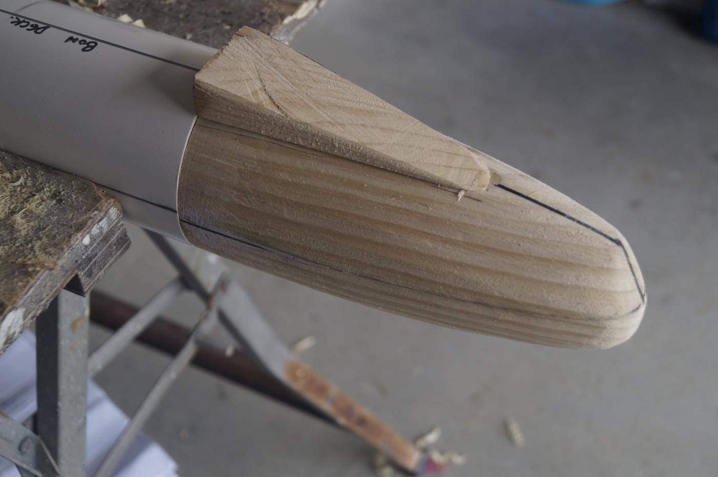 This would take some subtle work with the spoke shave and a light bit of sandpaper here and there. In the meantime making sure that the oval shape then blended smoothly with the round section of the PVC pipe.
