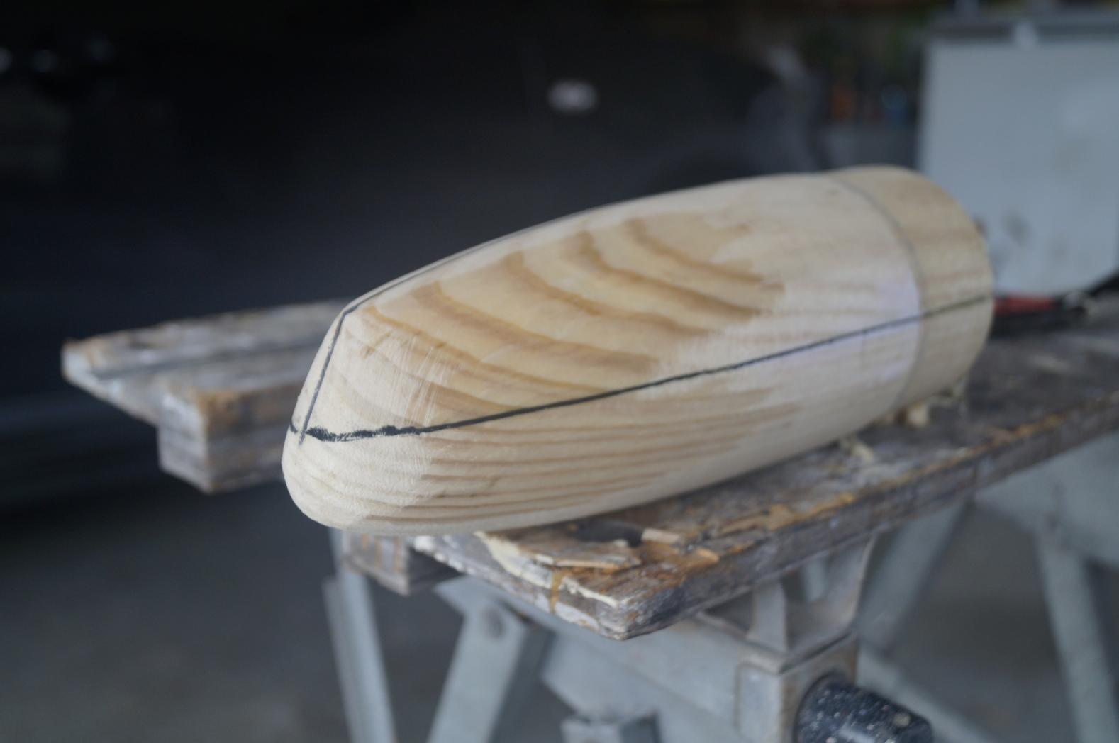 For my boat I am going to develop a wooden master with the stern and bow turned up on a lathe initially and stuck either side of a PVC tube. At least with the PVC pipe the midsection should be precise. Gluing two blocks of pine together and getting on the lathe I came up with the basic shape of both ends reasonably quickly.