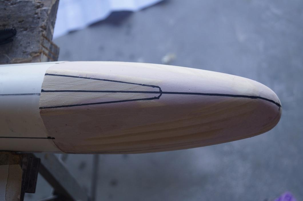 The first major task was to get the Bow section looking ballpark. This would require using a spoke shave to shave around the sides of the bow to start getting that roughly oval shaped cross section that is needed. Then creating the forward sloping box section that is characteristic of British Nukes.