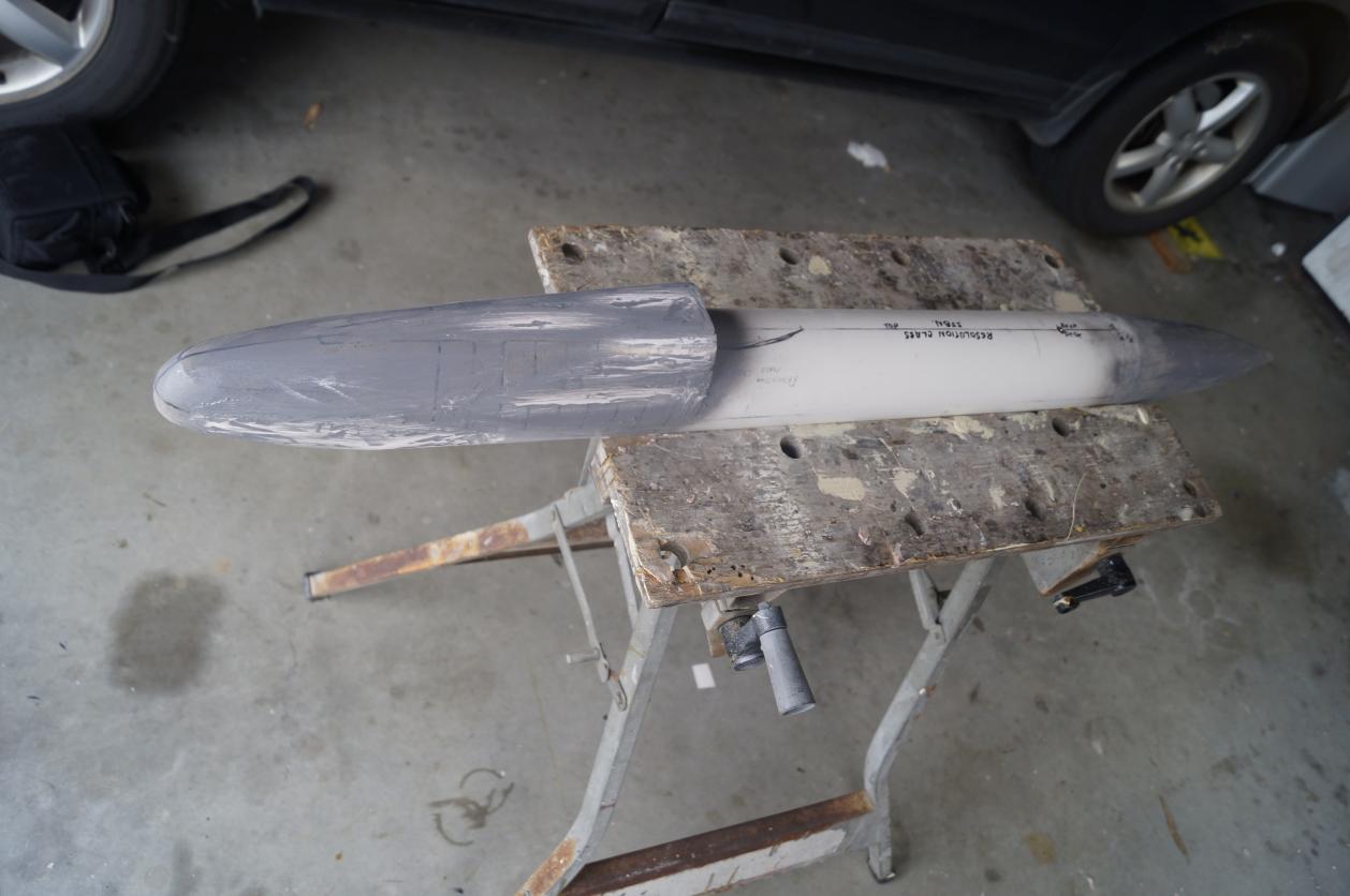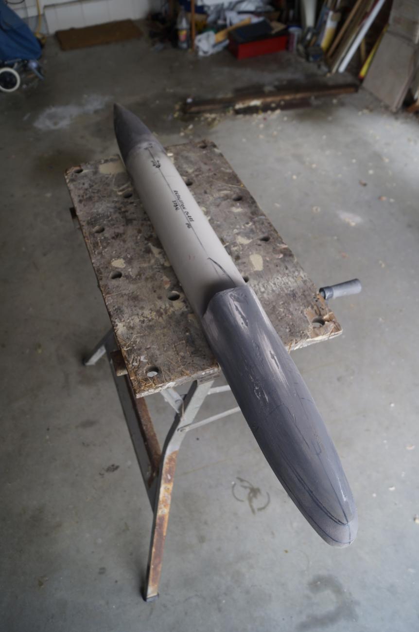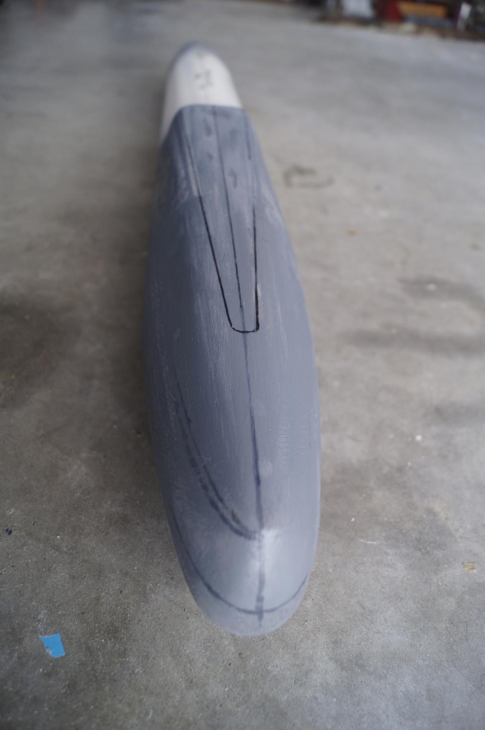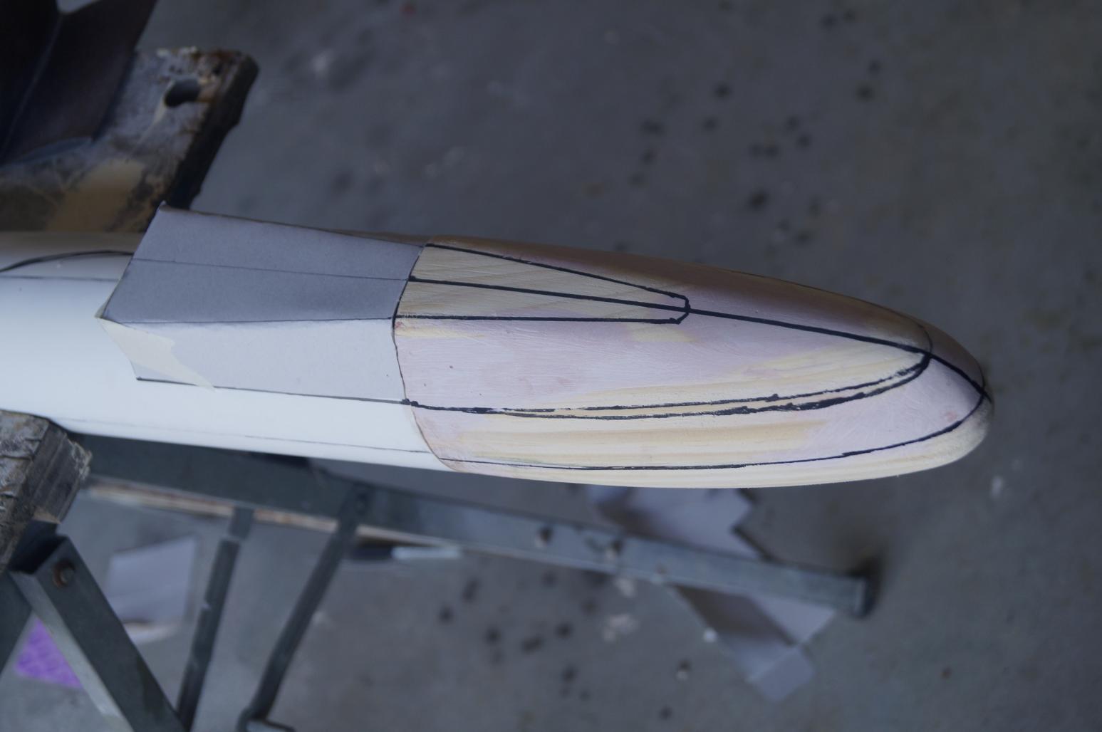 As you can see here I have used some cardboard to get an idea of the transition from the bow section to the PVC pipe section. It is in this section that you get the gradual transition from oval to a more flat topped section eventually leading to the missile deck.