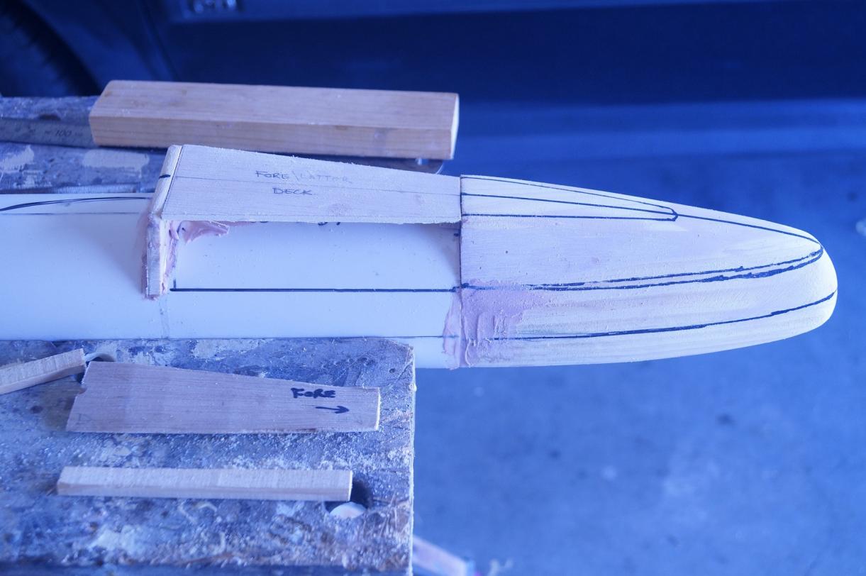 I made a series of templates to get the symmetry right. I also made the two side pieces out of pieces of plywood that I had cut grooves in the back of. Then steamed them with a slight warp in them. As these side pieces transition backwards they actually become more vertical. They were steamed and then clamped for about 2 days but still did’nt behave ,so I then fibre glassed the side of the pieces and they behaved after that. Then I simply had to the glue them to the side of the main deck that runs forward to the bow. I bevelled the bottom edge that glues onto the PVC so that It would limit the amount of filler needed and also would make for a smoother transition. I then would glue the back of the piece to the end profile that would meet the missile deck proper and then the front would be glued to the back end of the bow block and finally the top would but up against the underside of the forward deck as it slopes up and back to the sail.