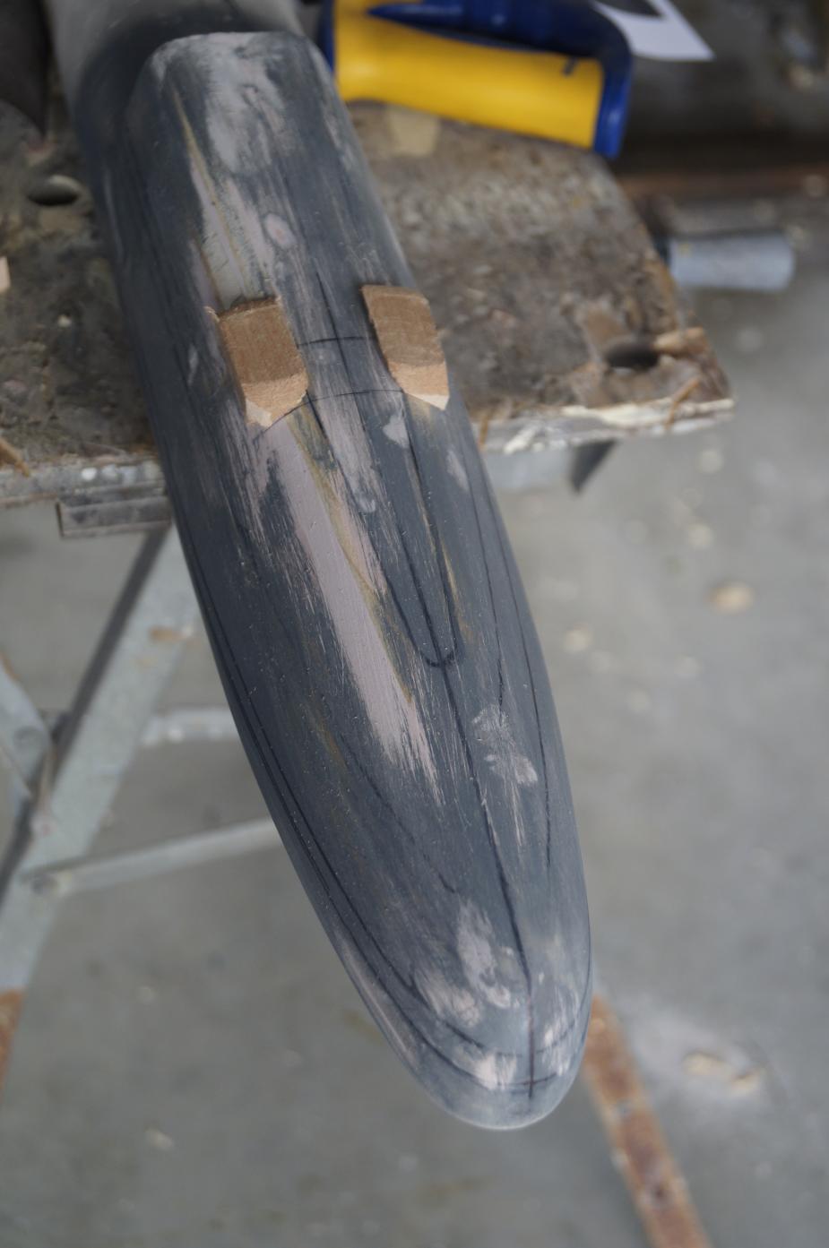 In order to do this I used small blocks of pine, shape them and then glue them to the sides of the bow at the appropriate place. Once these are in place then it is a case of using heaps of filer to get the right shape. This structure had a flat top surface that extended to where the hydroplanes started rotating. It angles away steeply at the front and less so at the rear. Making sure that the surface that the planes would be attached to would be slightly angled out and not create an 'undercut' would be important.