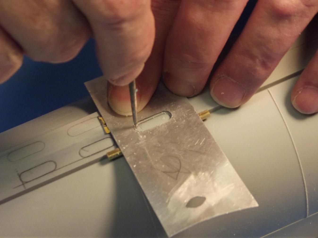 I have found that the back end of a stanley knife works well as an etching tool. Run along the edge of a ruler or a hard curved surface to follow the hull shape, works well. I also have some very small files and I have found that the point of these files also works well.