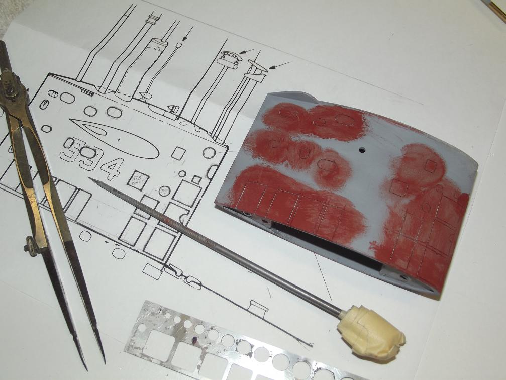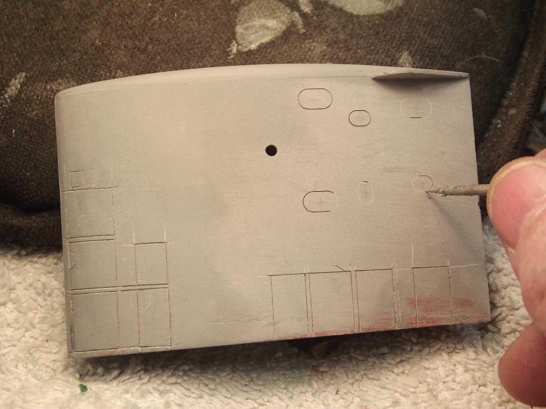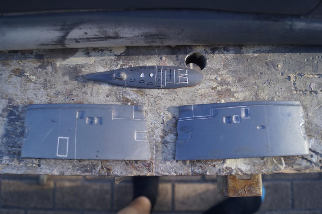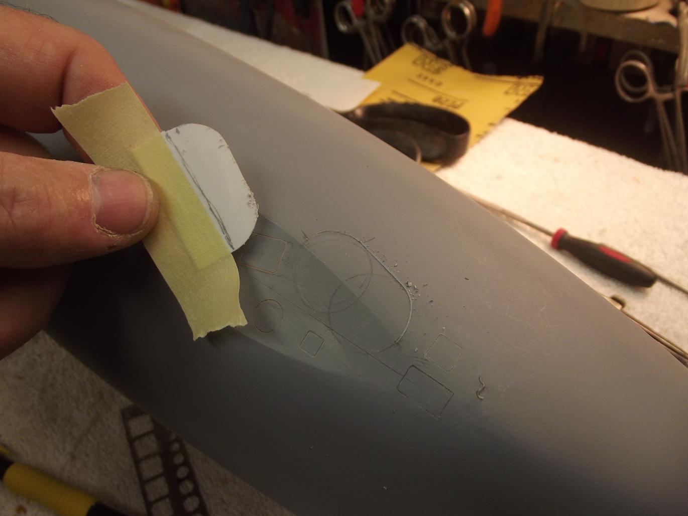 In some of these pics you can see the scribe work with the smaller masters. These include the two sides of the sail and the top of the sail along with the missile deck. To make the missile doors uniform I have created a small aluminium template to use with a scribe to etch the pattern into the deck. It works quiet well.