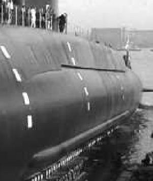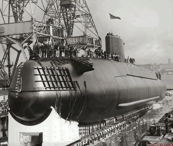 Don't let that frame-work you see over the bow sonar window fool you. I'm convinced its a temporary strong-back installed to keep the GRP window (I assume it's plastic, most acoustic windows of the time were) from blowing out as the forward group ballast tank flood-drain holes hit the drink as the beast slides down the ways.