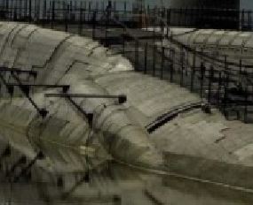 Another function of that temporary frame-work may be to keep the drag anchors, wires, chain and anchor buoy lines and other ground tackle from scaring the sonar window as it's paid out -- the ground tackle used to keep the boat from backing into the piers the other side of the basin once clear of the blocks and rails.