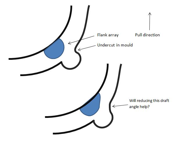 I will be making the moulds out of polyester resin and have had many years of experience using it to make moulds, however I have not made undercuts quite like this and wonder how well the mould and part will flex to get the undercut section out. I think I can reduce the draft angles substantially so that especially for the flank arrays the top edge of the array can have an almost vertical surface to it to reduce the draft angle coming out of the mould. How much undercut can you get away with? Or should I not even go there? I'm at a crossroad.. Do people just make a bulge and glue it on?