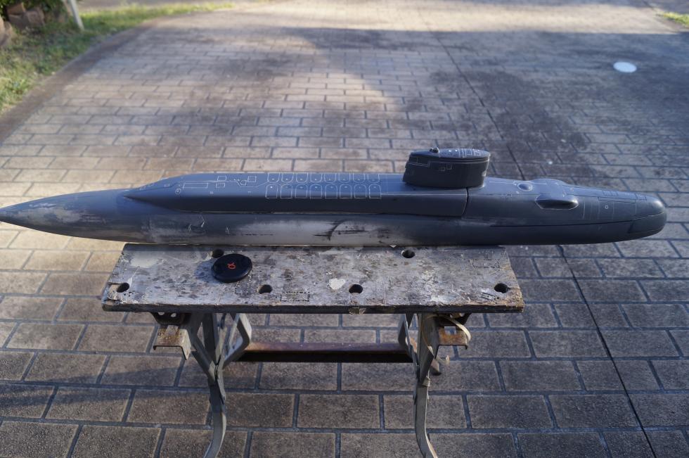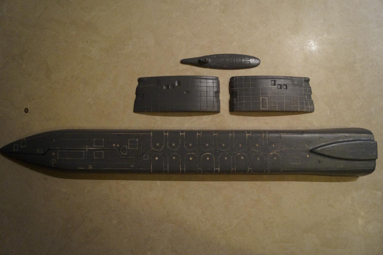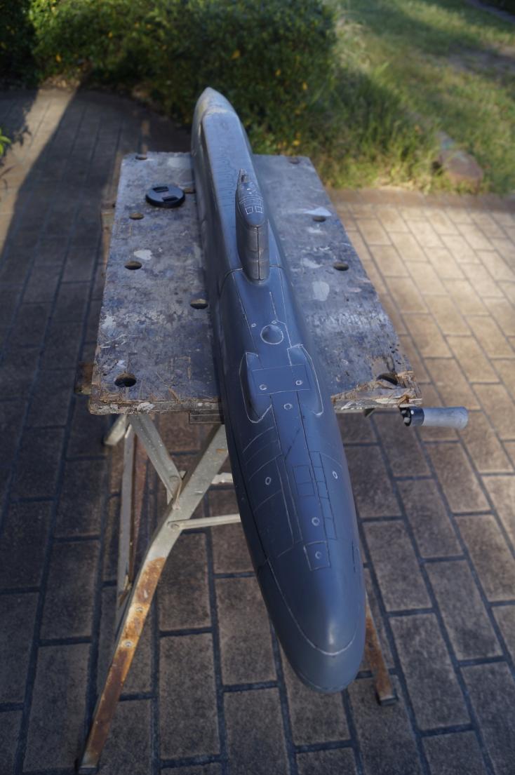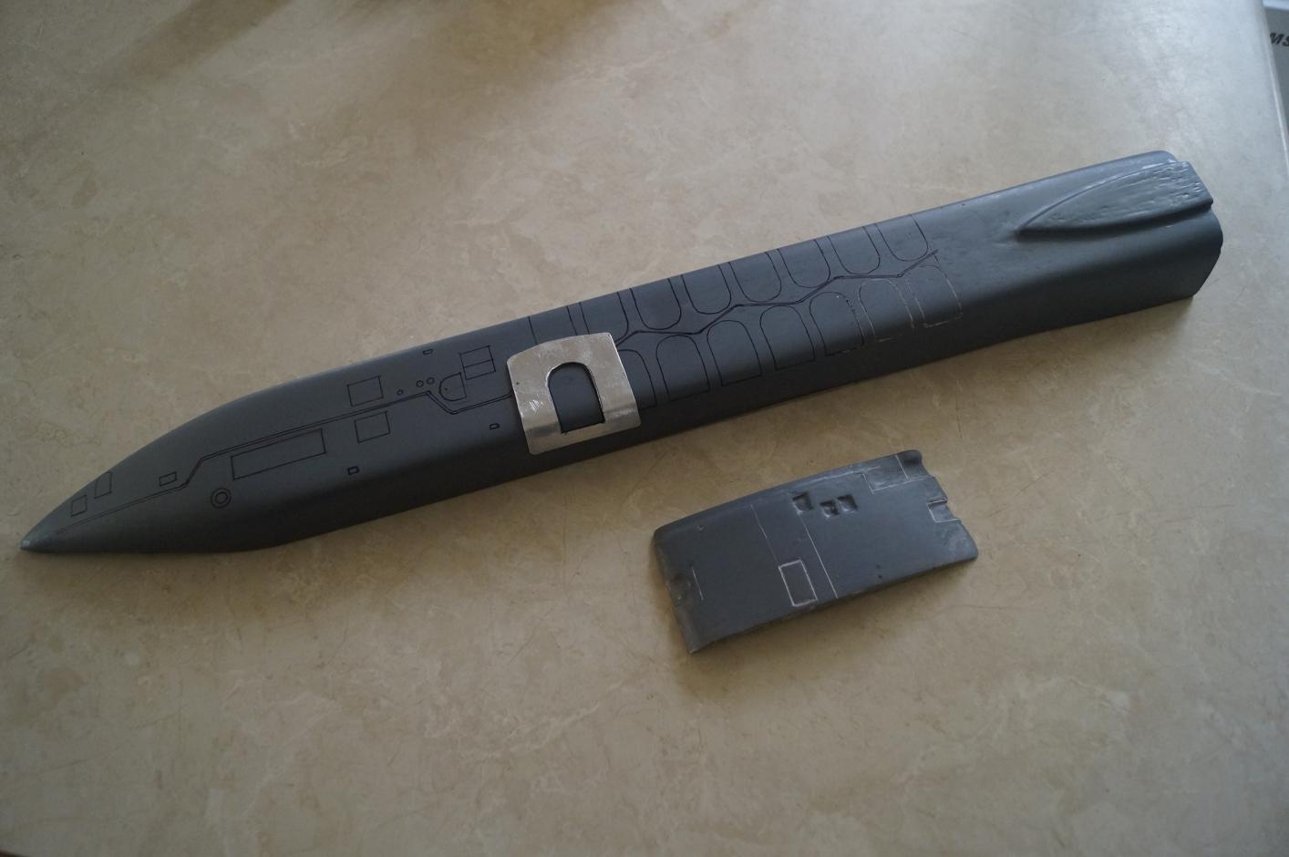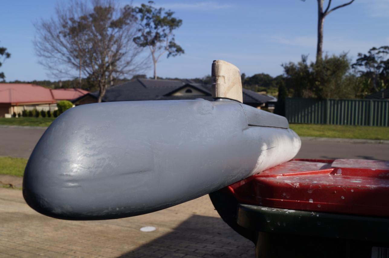 The resin coat is polyester. I have done the front and back of the hull and the four smaller pieces. I have also added a grey pigment to colour it like the primer. Once this was done then it was pretty much 200 grade wet and dry and working upwards. Sanding over the resin coat really smoothed down the outer surface and with a coat of primer smaller details, divits and bumps showed up effectively. The overall texture and surface is quiet nice. The hull would soon be ready for scribing the details along the hull. So I move from getting the overall shape right to getting the hull plate detail, cleats, hatches and weld lines right. I have fortunately been able to obtain numerous photos that show the front end of the boat and all the detail from the sail down to the very bow. I am still waiting a response from the MOD in London about releasing dry dock photos of the back end of the boat. The french have a whole SSBN on display ( Le Redoubtable) so I don't see what the impediment could be.