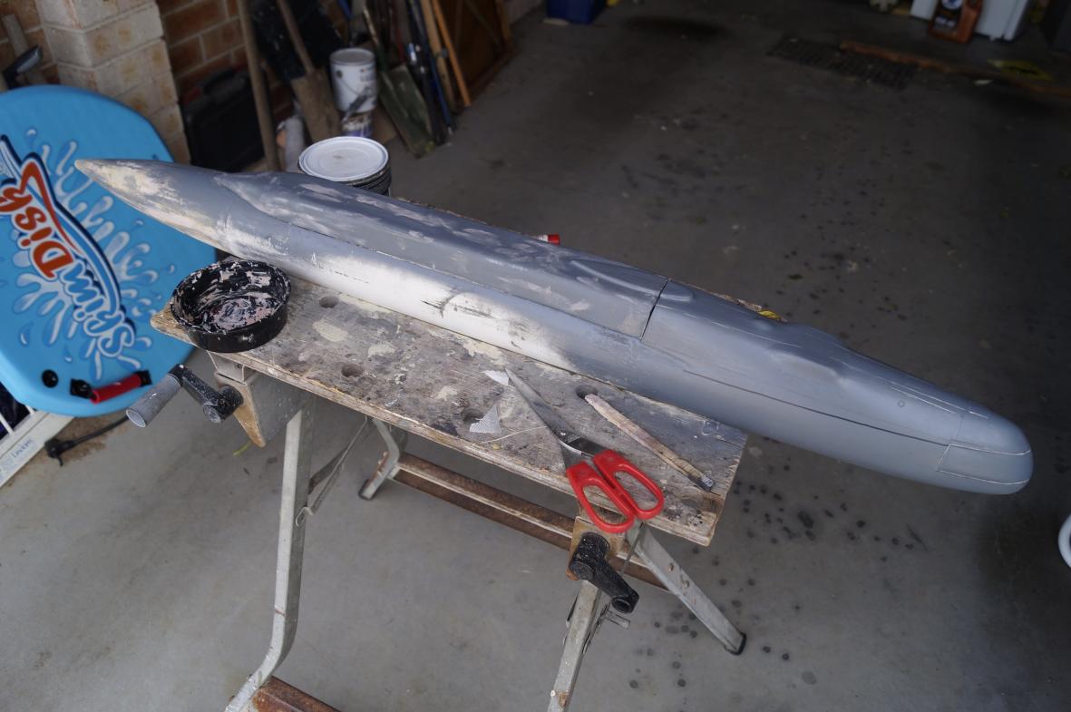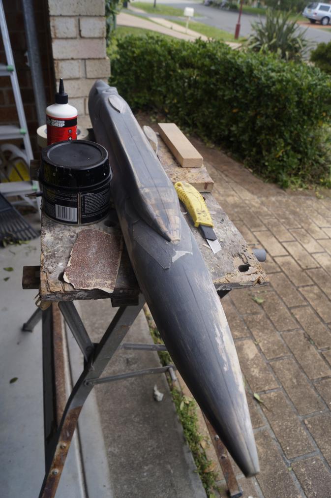 Then there would be lots of sanding and going over the over all shape of the boat to check for imperfections and divits. I also went over the shape once more and applied filler where necessary. This would all be done before putting a resin coat over the whole boat minus the PVC section in the middle.