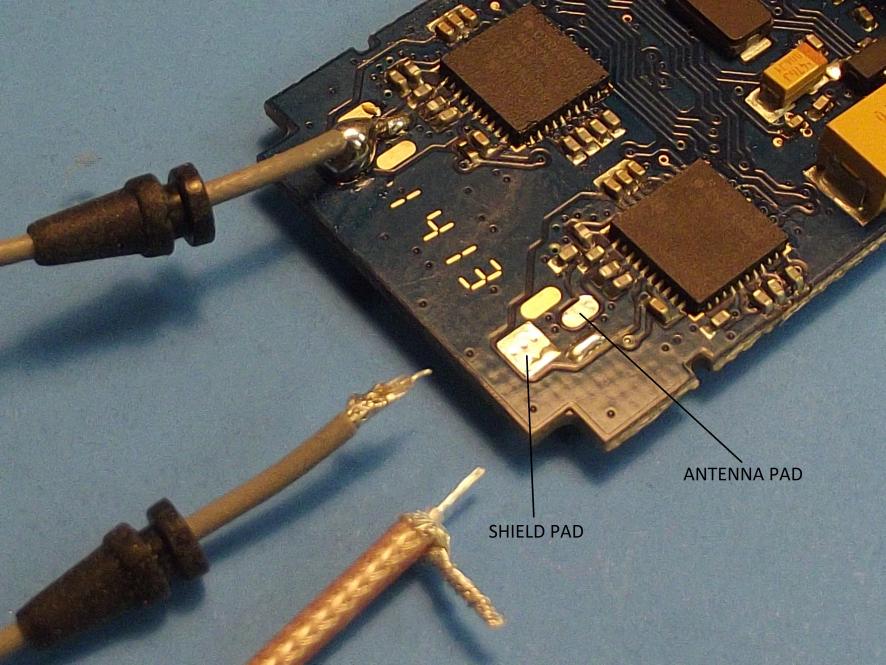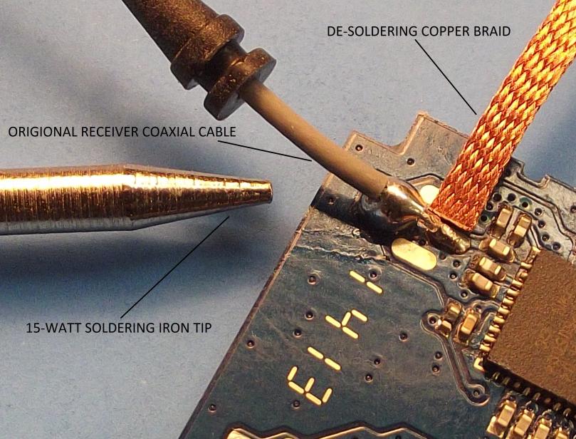 1. De-solder the existing receiver antenna or coaxial cable unions at the receiver PCB. This is done by heating the solder and either wicking it away through capillary action or use of a molten 'slurp gun. One the binding solder has been removed from between the receiver antenna and shield pad, the antenna/coax is pulled away. At this point the crystallized rosin (an artifact of the original soldering job) has made a mess on the face of the PCB -- this is easily removed with a stiff lacquer thinner drenched acid-brush and a low pressure air blow-down.