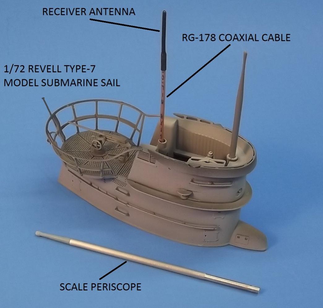 Your average real-world periscope tube is between seven and ten inches in diameter, that scales out to around 5/64" diameter for a 1/72 scale model submarine. Study the photo of this 1/72 Revell Type-7C model and how I replaced the number-2 scope provided in the kit with an aluminum tube topped with a hollowed out scope head: the coaxial cable running up the tube, terminating in the antenna that sits within the RF transparent plastic scope head. Obviously, the larger the scale, the easier the task of hiding the receiver antenna.