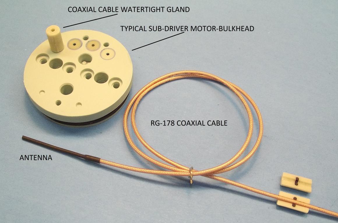 ESTABLISHING LENGTH OF COAX CABLE The length of coaxial cable needed between the Sub-driver/WTC and antenna is of course driven by the scale and model submarine subject. Two-feet of RG-187, .071" diameter coaxial cable has been provided -- more than enough for most model submarine subjects. You will determine the length of coaxial cable you need by a dry-fit of the cable -- one end (dry side) runs into the SD to a position where the receiver will go, and the other (wet side) end of coax sized to run up into the models sail and up into a suitably modified scope tube or mast to place the antenna, atop the coaxial cable, as high as possible. You also must account for the slack in the coaxial cable required to permit easy access the models interior as you lift its upper hull off and set it aside next to the lower hull.