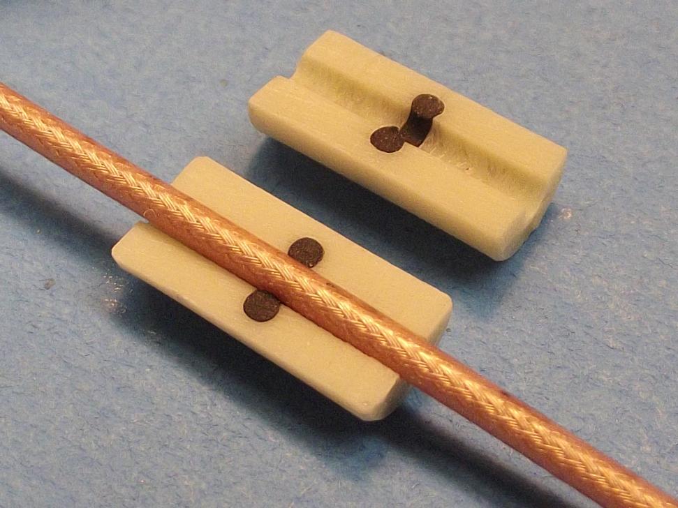 So, to get the 2.4gHz r/c system to work with the model submerged we have to get the antenna off the receiver printed circuit board, and place it to a point atop the sail. And doing so while keeping the antenna geometry to the critical 1.25" length. And insuring an unobstructed (by water or other RF blocking structure) line-of-sight between transmitter and receiver antenna. This repositioning is done by splicing in a length of coaxial cable between receiver and receiver antenna.