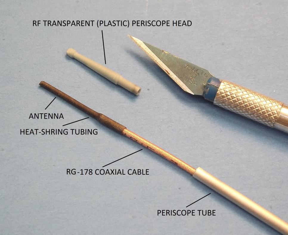 HIDING THE ANTENNA ATOP THE MODELS SAIL Most of us drive scale model submarines, and want to hide the receiver antenna as best we can. A sometimes difficult task on model submarines representing subjects in scales smaller than 1/96. The obvious answer is to run the coaxial cable, topped by the receiver antenna up a hollow tube -- that tube representing either a periscope tube or other retractable mast unique to the submarine in question. Metal tubes would attenuate the signal to the antenna, so that portion of scope or mast must be of an RF transparent material (no metal, no carbon) which is pretty much transparent to RF energy in this band.