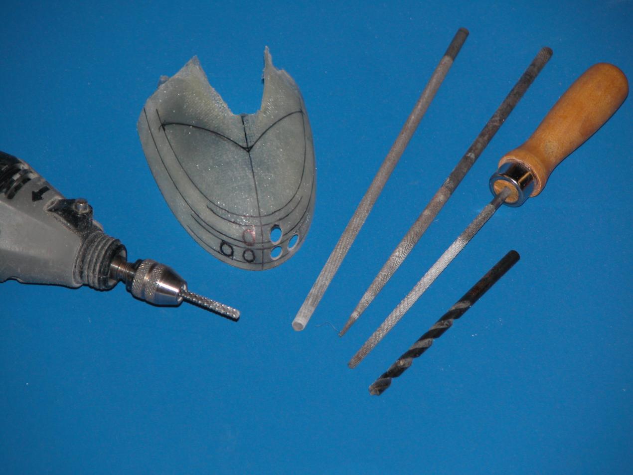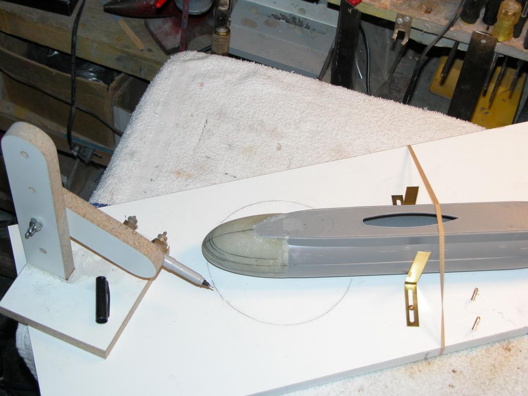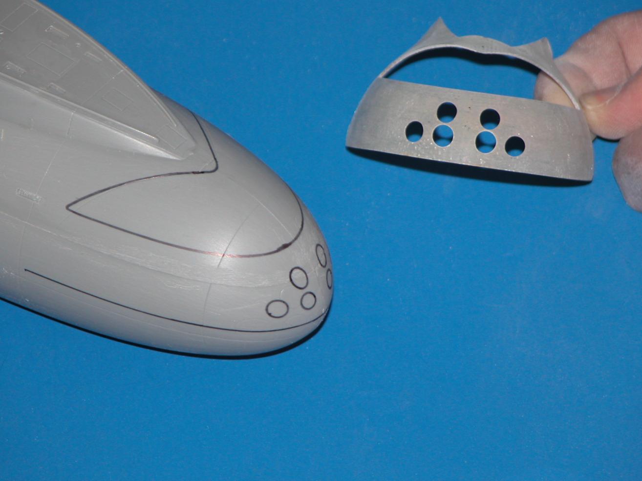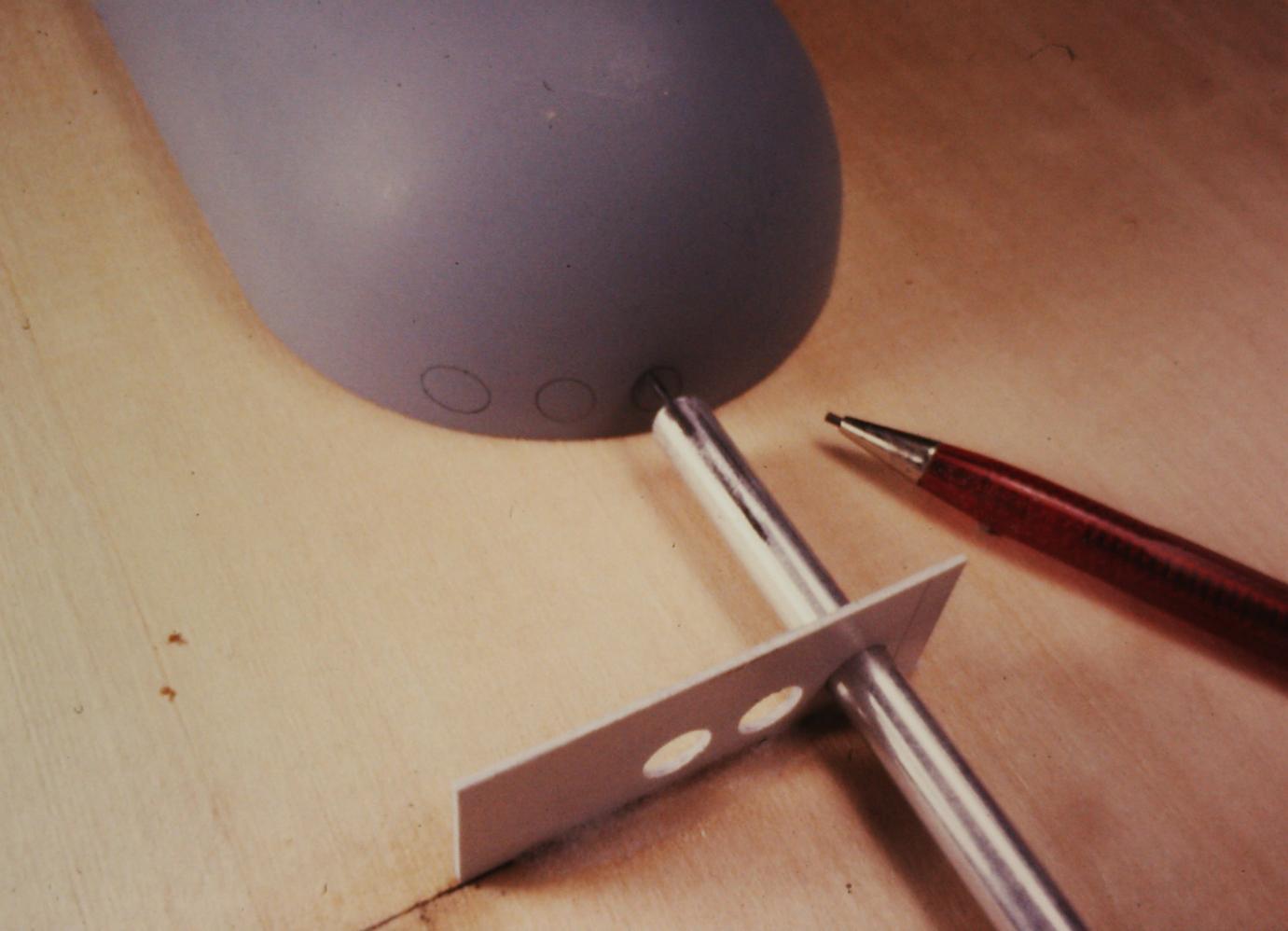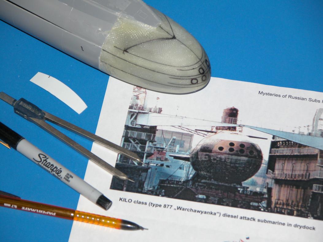 ID:	97599 The simplest way to make the scribing stencil torpedo tube muzzle door circles is to mark out the maximum height and width of the holes onto the face of the stencil -- some careful lay-out work here as you loft the information off planes, photos, and drawings. Then, its a simple matter to yank the stencil off the bow (it was there as you laid out the boarders of the eventual cut-outs), punch rough holes, then finish them off with a round-file of the correct diameter -- taking care to keep the long axis of the file parallel with the long-axis of the hull (I assume all Ruski boats bore-sight their tubes parallel with the boats longitudinal axis).