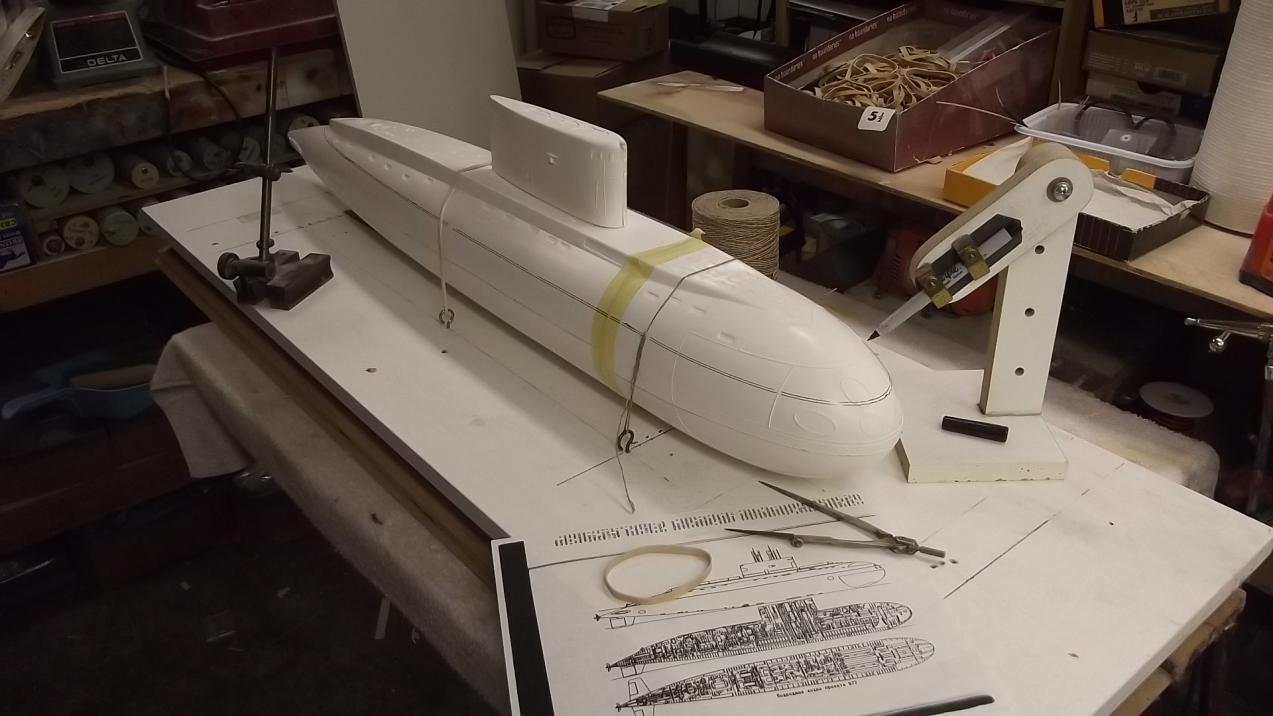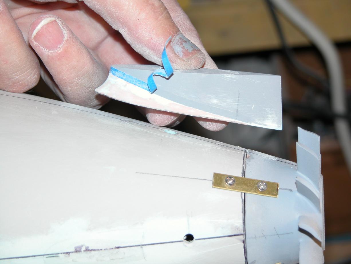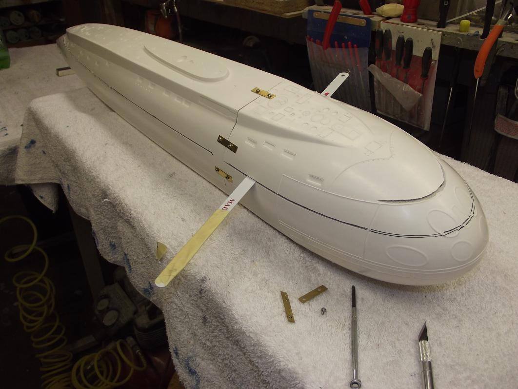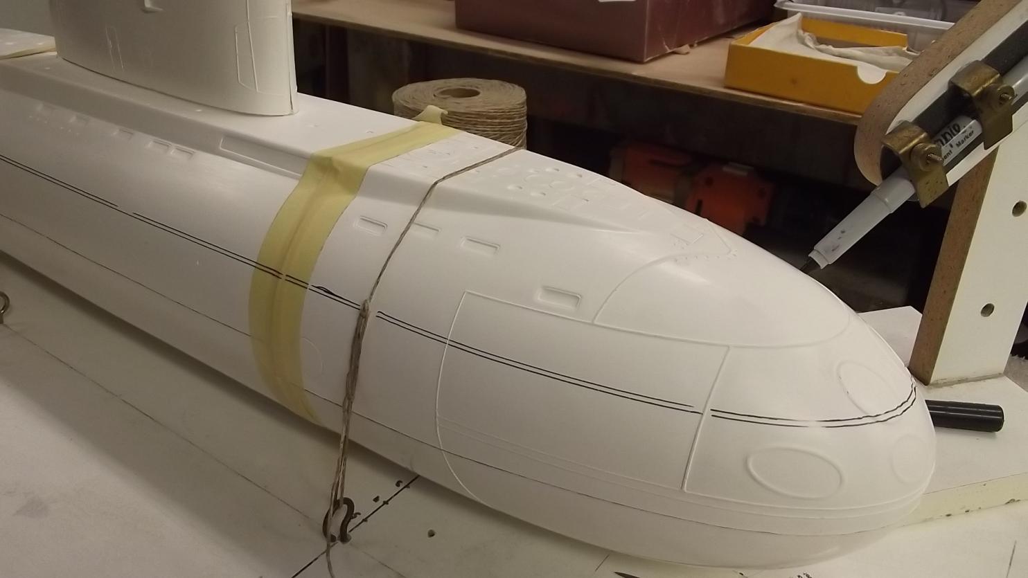 The only jog away from the single-plane equatorial split was at the bow. As I wanted this to be a torpedo shooter (my boat anyway!) I made this vertical transition so I could keep all the muzzle doors on the lower hull.