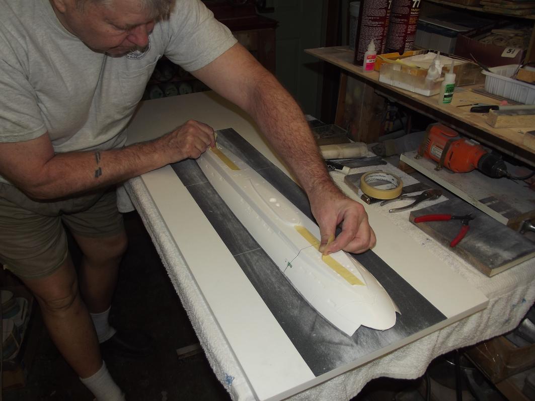 So, I tape the bow and stern together as straight as I can, mount the hull on my molding board, strap it down, and use my waterline marking tool to establish the kerf zone. As long as I keep the cut within those lines I will be able to later accurately re-establish the height of the lost material (eaten up by the cut-off wheel used to make the equatorial cuts) and make it back up with filler or CA-baking soda.