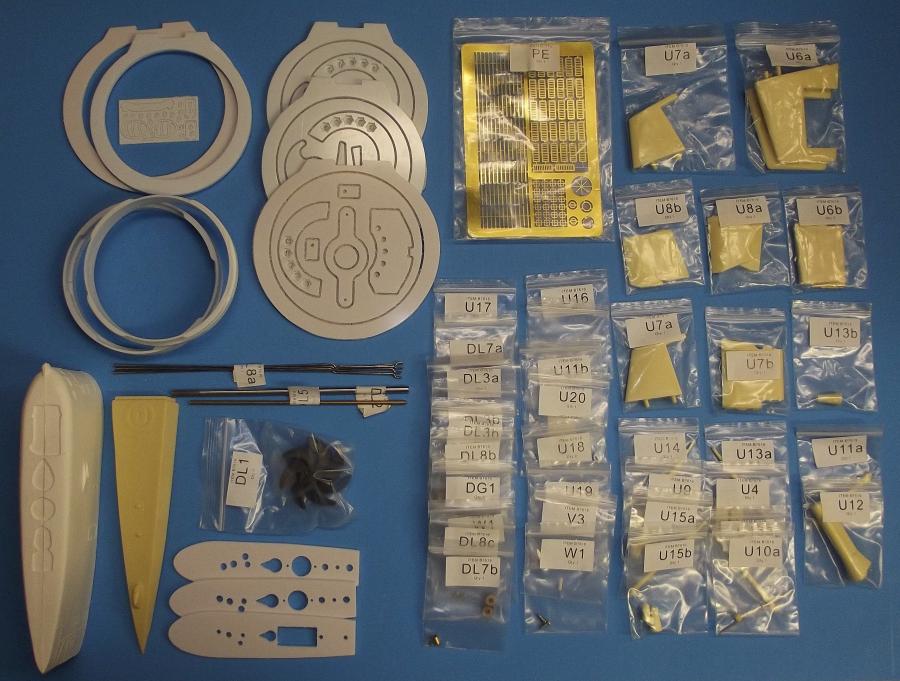 First off, I don't think this kit was supposed to have a GRP hull initially -- I think old Feng was going for a blow-molded hull with a short cast resin tail-cone. Anyway, that's what I surmise from the comprehensive but confusing instructions: a delightful mix of chinglish and Mandarin; that coupled with the fact that the illustrations point to a homogeneous hull and tail-cone, but what is provided is a radially split forward and after hull halfs that are to be joined with a very flimsy looking plastic bayonet-ring type union.