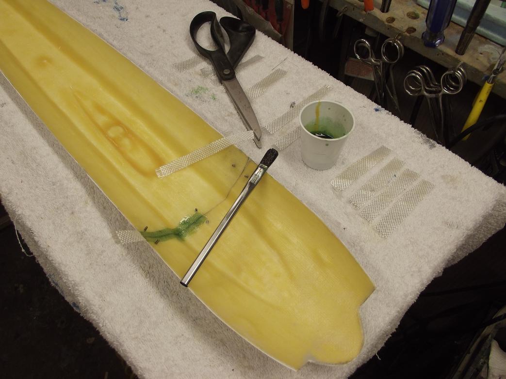 All that hacking and slashing out of the way, I re-enforced the radial breaks from the inside with fiberglass tape and some hot formula West System laminating epoxy. Tomorrow, when I get up, I can take off the brass straps and lay down a wider piece of re-enforcing GRP over those breaks. Then on to the never-ending job of getting the kerf lost edges built back up and trued.